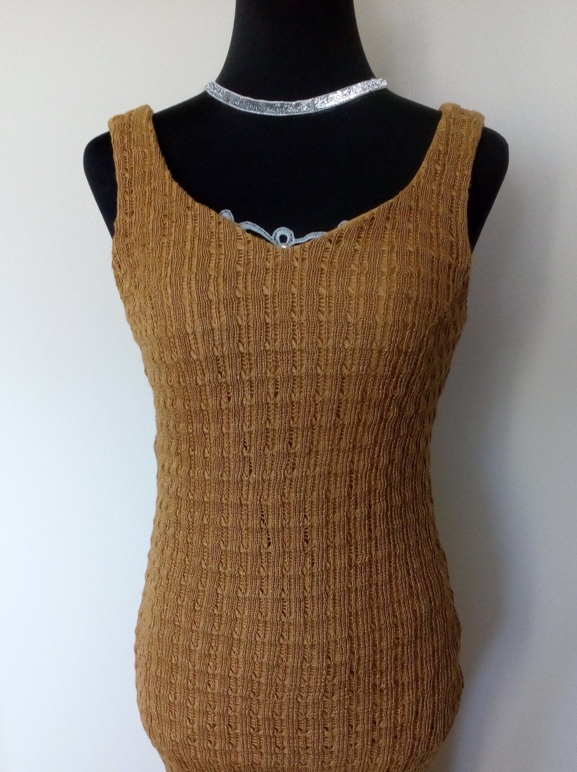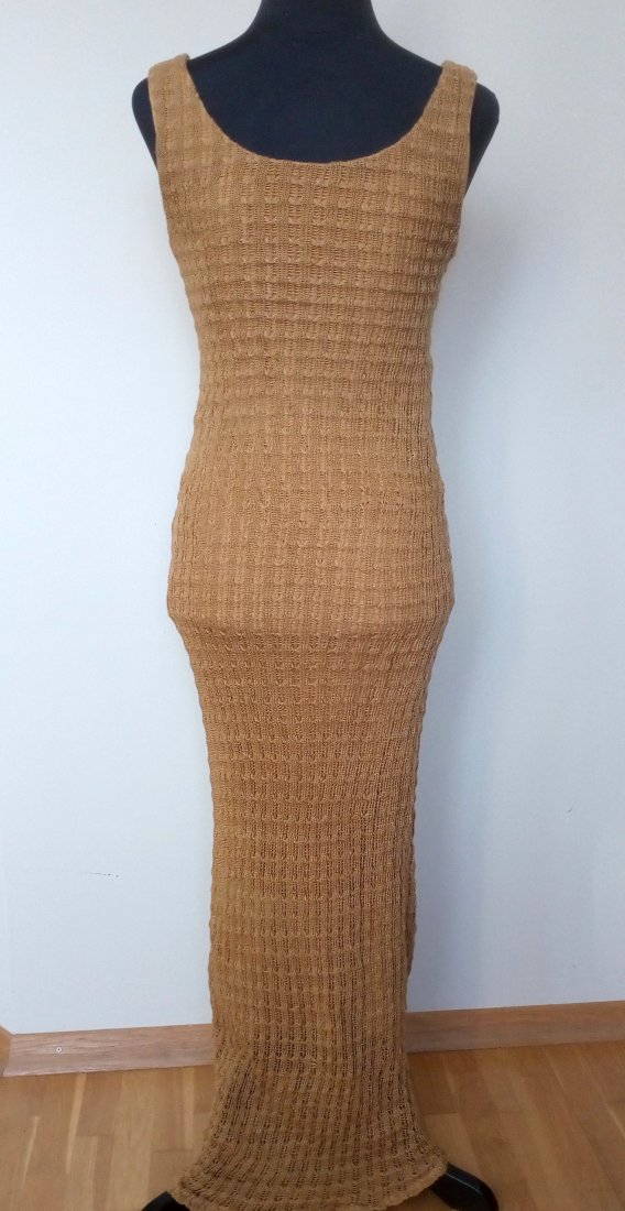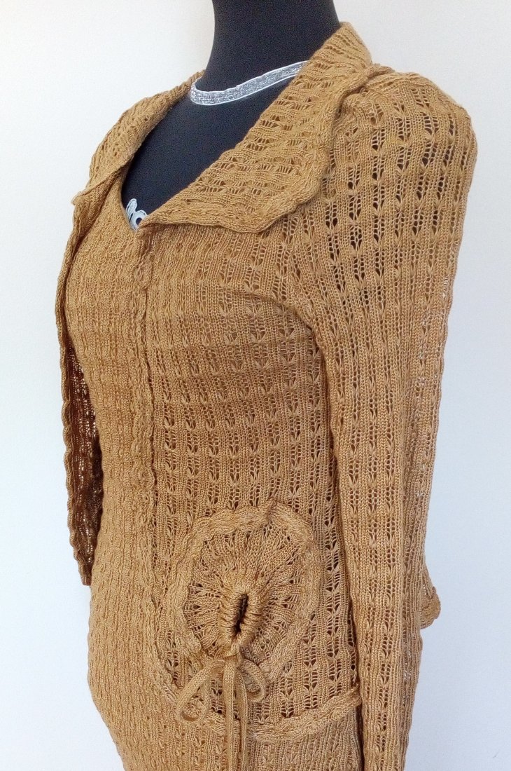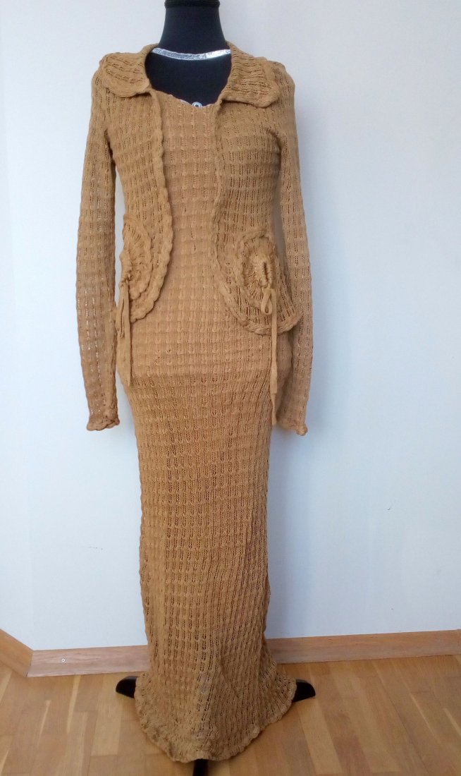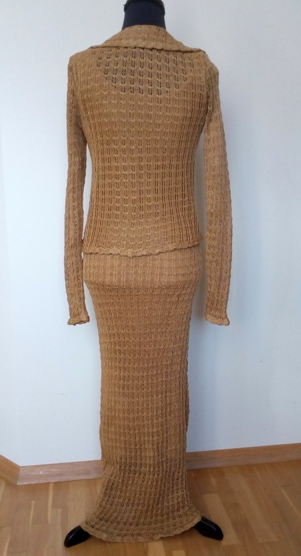 Lniany, dzianinowy komplet - sukienka plus sweter, kolor orzechowy, sukienka tuba na jerseyowej podszewce, sweter bez zapięcia z okrągłym kołnierzem, po bokach z ozdobnymi niby kieszonkami w kształcie koła, ściąganymi trokami, całość ażurowa