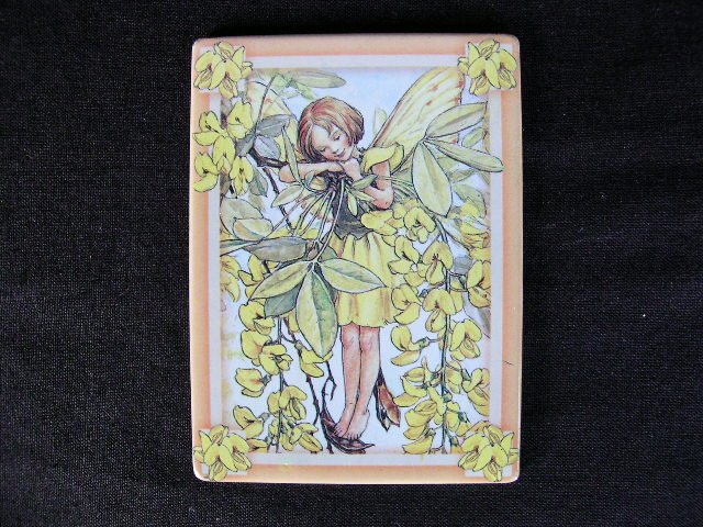 Metalowy magnes z reprodukcją jednej z kwiatowych wróżek od Cicely Mary Barker. 6,5 x 9 cm. Stan zachowania dobry; blaszka pod światło ze śladami użytkowania.