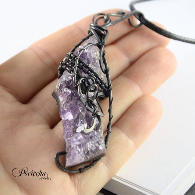 Niezwykły wisior stworzony od podstaw ręcznie z miedzi oraz pięknej szczotki ametystu. Kamień misternie opleciony miedzią, którą spatynowałam na ciemny kolor.