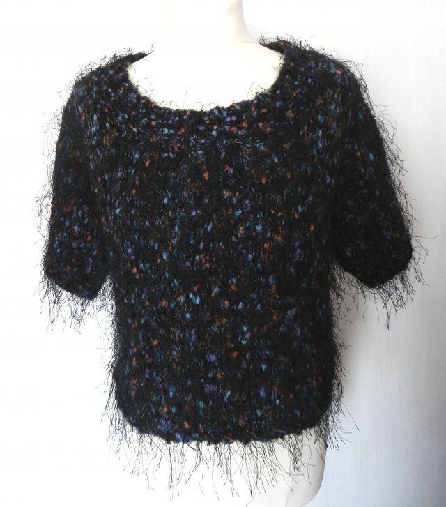 Krótki rekaw do łokcia, ciekawa kolorystyka fiolet niebieski dominujaca czerń i odcień ceglastego
