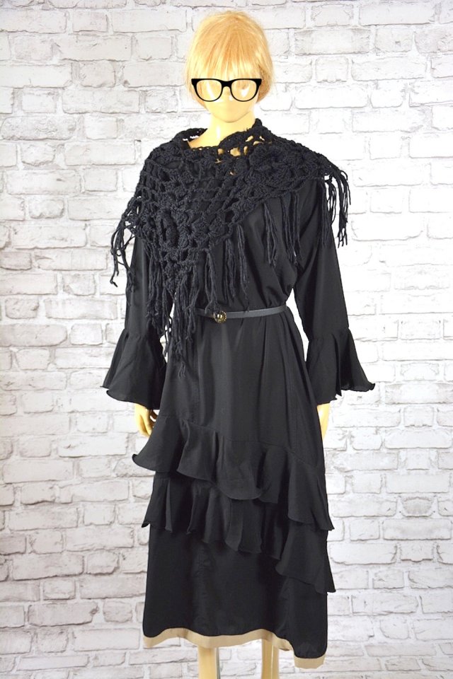 Unikatowa czarna sukienka w stylu vintage o poszerzanym kroju , dół sukienki ułożony z piętrowych falban wykończona jaśniejszą lamówką, rękawy u dołu porzeszane, z tyłu zapięcie na suwak. Sukienka ładnie się sprawdza noszona zarówno z paseczkiem jak i bez. Sprzedawana bez dodatków.