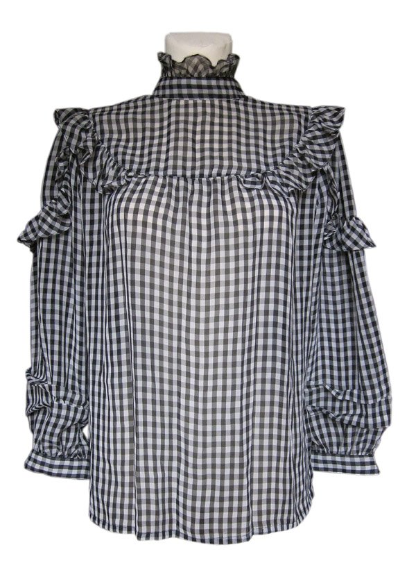 Bardzo ciekawa bluzka w kratkę z falbankami. Czarno-biała. Lekko przezroczysta. Tył zapinany na guziki. Przy rękawach zaszewki, które można odpruć na dłuższy rękaw. Szczegóły widoczne na zdjęciach. Bardzo ładna! Stan: bdb! Rozmiar 38. NIE POCHODZI Z SECONDHANDU. W razie pytań, proszę o kontakt.