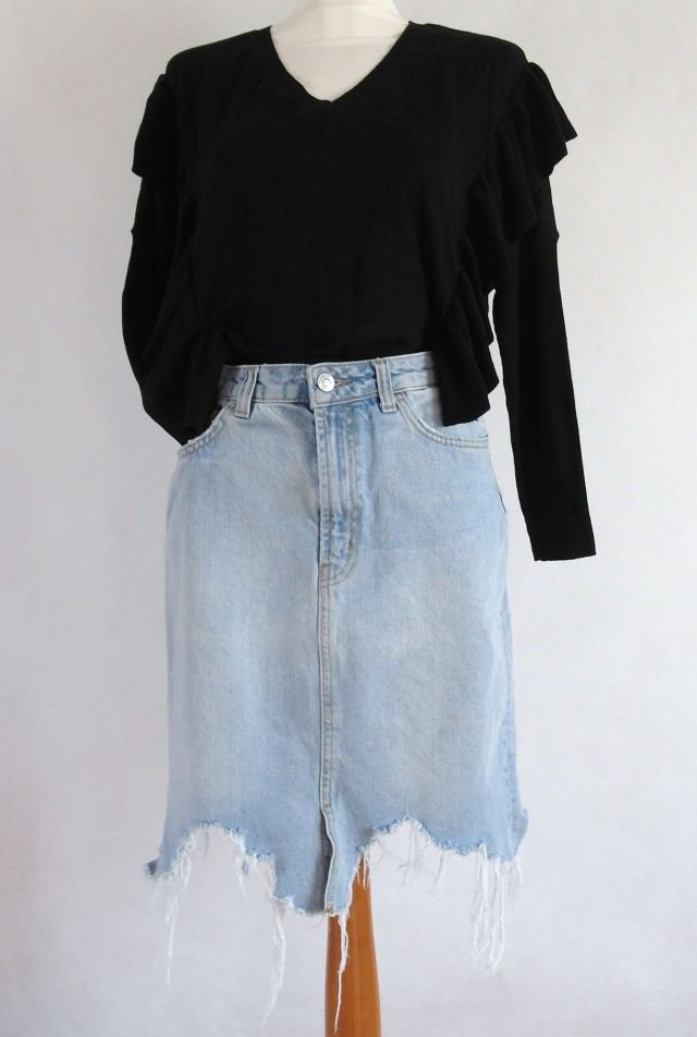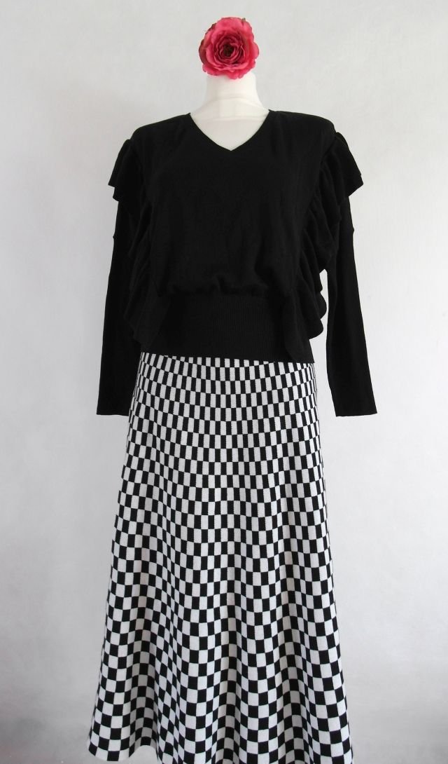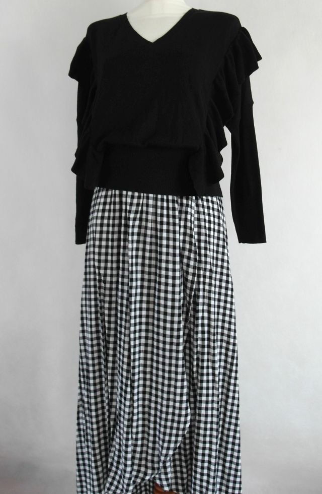 czarny, ozdobiony na bokach falbanką (tylko z przodu).fason - lata 80-te, szeroki w pachach, wąski u dołu.rękawy wąskie,ale wygodne, prążkowane.