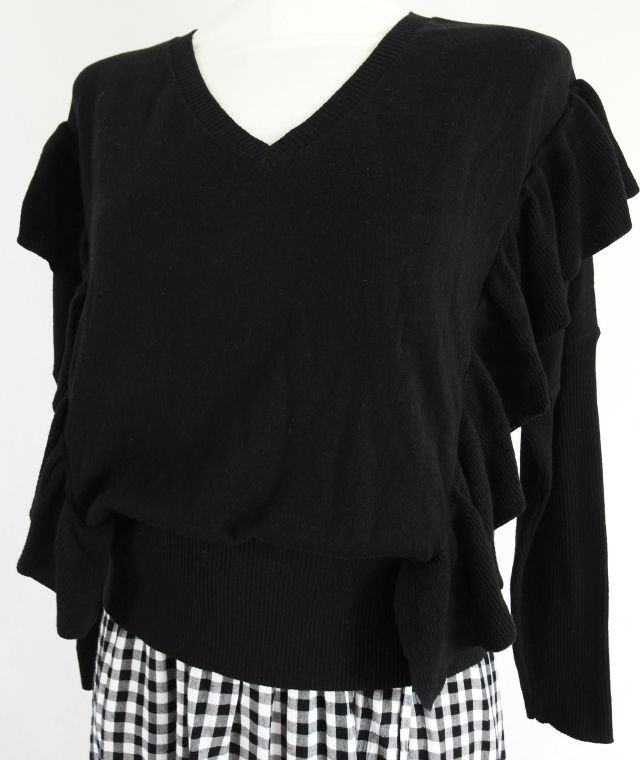 czarny, ozdobiony na bokach falbanką (tylko z przodu).fason - lata 80-te, szeroki w pachach, wąski u dołu.rękawy wąskie,ale wygodne, prążkowane.