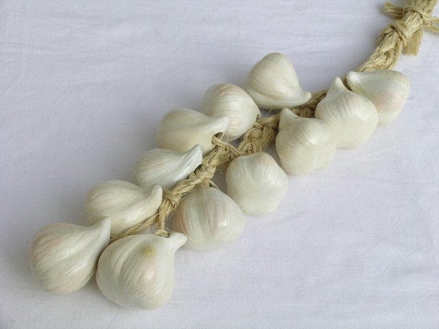 Świetnie wykonany ceramiczny - naturalnej wielkości - czosnkowy warkocz dekoracyjny. Do domu, restauracji :) Przyjemnie dźwięczący, na satynowo-błyszcząco szkliwiony. Sznurek naturalny i masa porcelanowo-ceramiczna. Długość 48 cm ! Stan zachowania bardzo dobry. Przyjemnie ciężki.