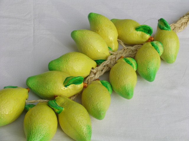 Świetnie wykonany ceramiczny, naturalnej wielkości limonkowy warkocz dekoracyjny. Do domu, restauracji :) Przyjemnie dźwięczący, na satynowo-błyszcząco szkliwiony. Sznurek naturalny i masa porcelanowo-ceramiczna. Długość 48 cm ! Stan zachowania bardzo dobry. Przyjemnie ciężki.
