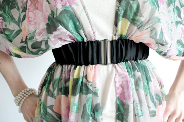 Zwiewna narzutka w półtransparentne kwiaty. Narzutka jest luźna, jednak sylwetkę pokreśla gumowy pasek w talii.