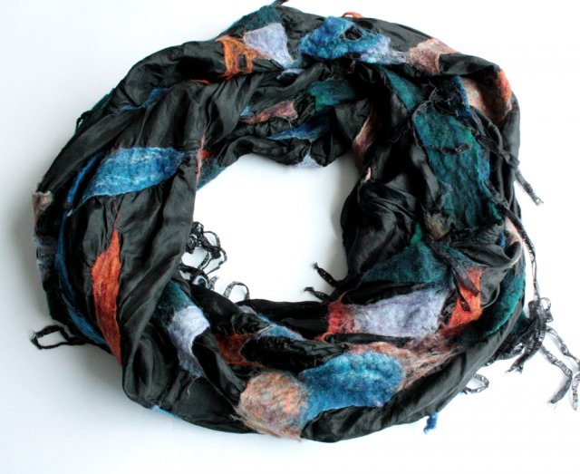 Fantazyjny szal z frędzlami z trzech stron (jeden dłuższy bok nie posiada frędzli). Według mnie szal wykonano z jedwabiu i ozdobiono go nieregularnymi elementami wykonanymi prawdopodobnie z prasowanej wełny (cienkiego, miękkiego filcu).