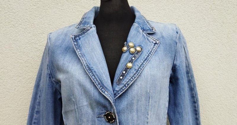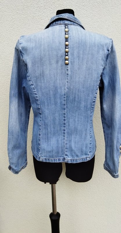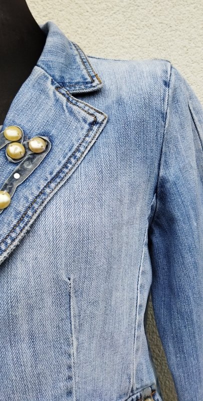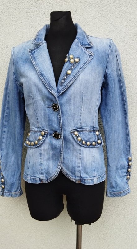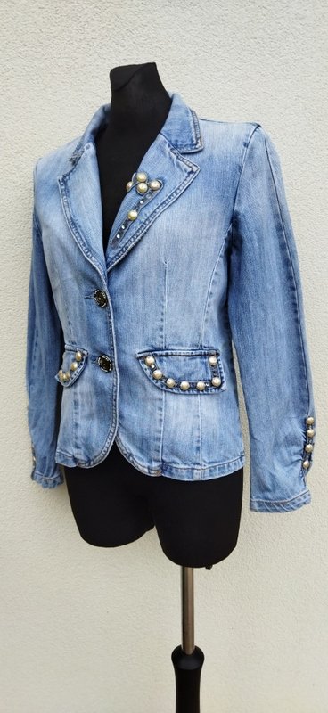 Świetna marynarka z jeansowej tkaniny w przecieranym jasnoniebieskim kolorze. Taliowana z kołnierzem z rewersami z dwiema patkami imitującymi wpuszczane kieszenie. Zdobiona perłami i dżetami. zapinana na dwa napowe metalowe biżuteryjne guziki. Bez podszewki.