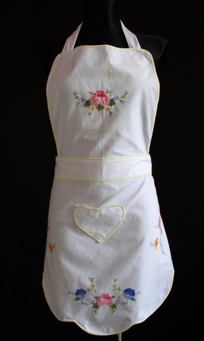 Fartuszek vintage,brak metek.Materiał białe płótno.Brzegi obszyte jasno żółtą plisą.Odcięty w pasie + wstawiony pas z wiązaniem z tyłu.Pasek na szyi zapinany na guzik.W dole na środku kieszonka w kształcie serca.Ozdobiony aplikacjami i haftem.Stan ogólny dobry w górnej części żółta plama.Długość mierzona przez środek 79 cm.środek razem z wiązaniem 155 cm.