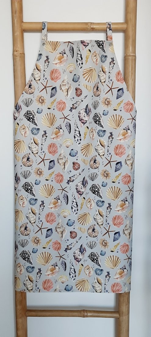 Fartuszek kuchenny został uszyty z 100% przyjemnej w dotyku bawełny. Widoczny nietuzinkowy nadruk muszli bardzo ładnie prezentuje się na szarym tle. Posiada praktyczne, wygodne troczki do wiązania. Dostępny również w bieli i granacie.