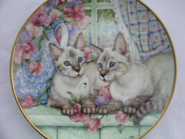 Fantastycznie koci talerz porcelanowy z kolekcjonerskiej serii od Danbury Mint z autorskim zdobieniami Debbie Cook. Tu koty syjamskie :) Rant złocony, wysoka jakość malatury, satynowo-błyszczące szkliwienie. 21 x 2 cm. Stan zachowania bardzo dobry.