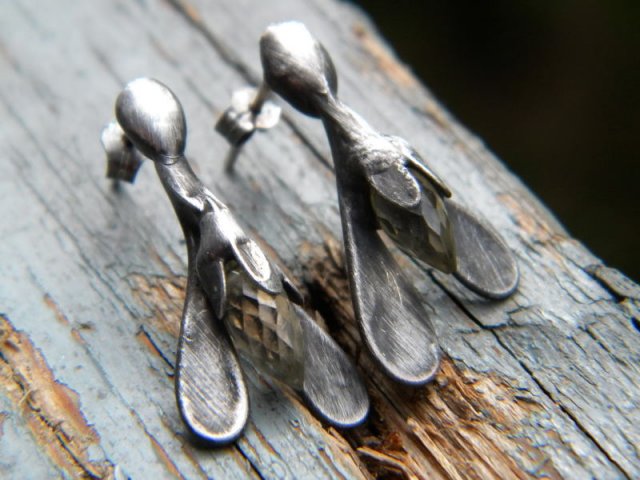 kolczyki wykonane ze fasetowanych kwarców oprawionych w ocynowaną miedz. sztyfty i baranki ze srebra 925. długość kolczyków 2,7cm , rozpietość 1,3cm