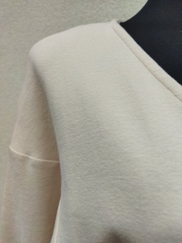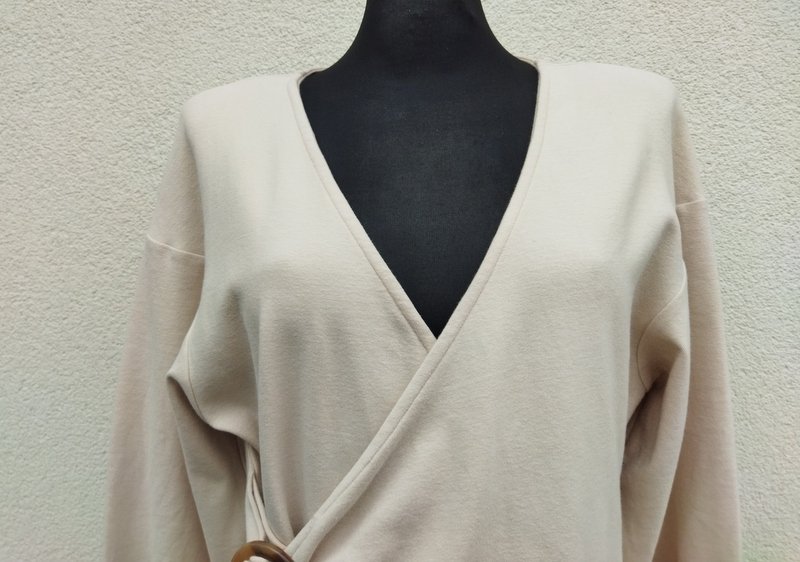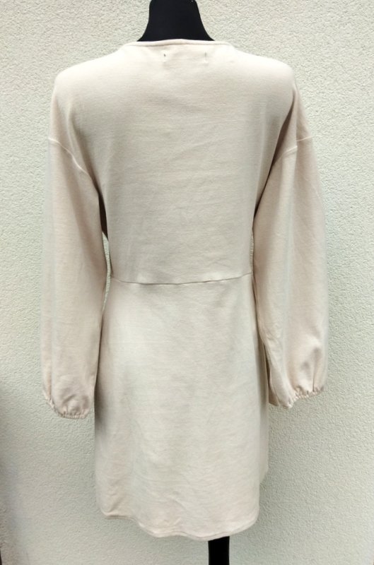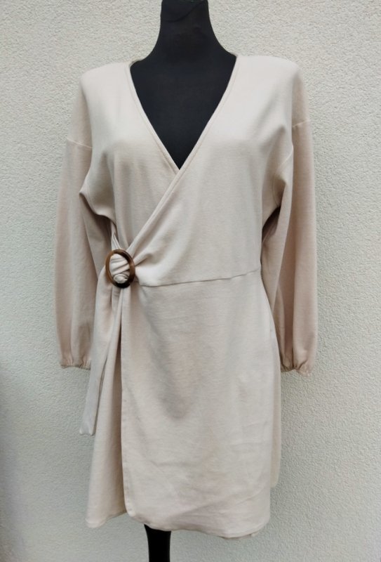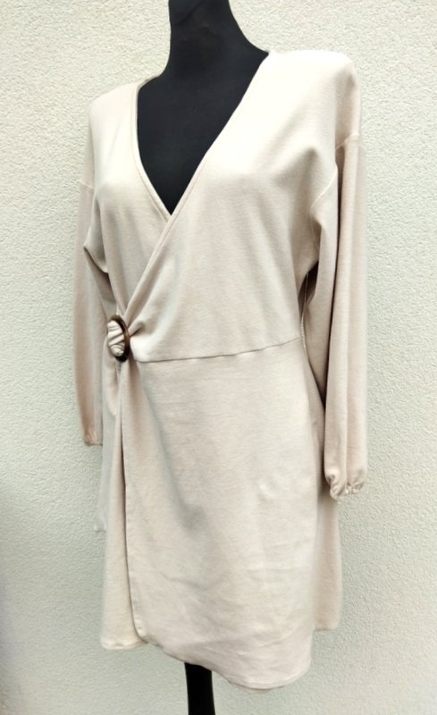 Sukienka z bawełnianej dzianinowej tkaniny a 'la dresowej w kolorze jaśniutkiego beżu. Odcinana w pasie , zakładana kopertowo z jednego boku zapinana na guzik z drugiego przeciągana przez pasek z klamerką, rękawy dołem zebrane wszytą gumką.