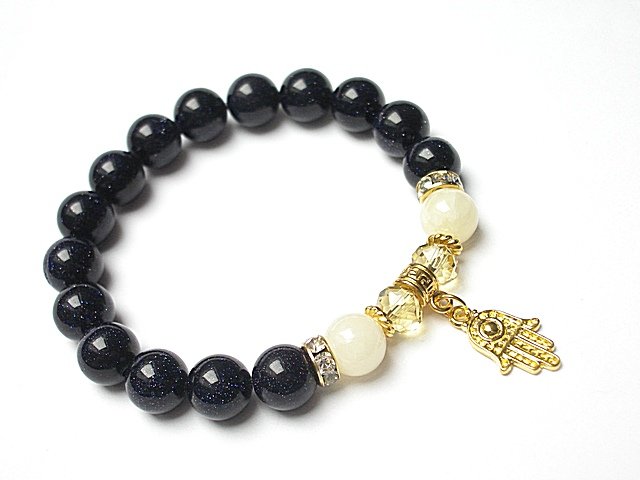 Bransoletka wykonana z kuleczek nocy kairu [10mm] ,jadeitów [10mm ] .kryształków [8mm] oraz elementów metalowych w kolorze złota. Bransoletka na gumce silikonowej. Pasuje na nadgarstek 16-17cm. Biżuteria ozdobnie zapakowana. Możliwość dopasowania bransoletki do nadgarstka - wcześniej prosimy o kontakt.