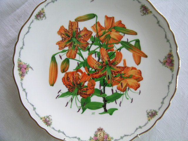 Dekoracyjny talerz porcelanowy, sygnowany jakością Royal Albert - z kolekcjonerskiej serii Queen Mothers Favourite Flowers ze zdobieniami autorstwa Sary Anne Schofield. Swobodna malarska kreska i fantastycznie kolorowa malatura - kwiaty jak żywe :) Talerz notowany na międzynarodowej liście Bradexu (26-R64-1.5) pod indywidualnym numerem 1405D. Edycja limitowana tylko do 150 dni wypału. Rant złocony, delikatnie ryflowany. Błyszczące szkliwienie. 21,5 x 1,5 cm. Stan zachowania bardzo dobry. Wartość kolekcjonerska... i nie tylko :) W załaczeniu oryginalny certyfikat i broszura kolekcjonerska.