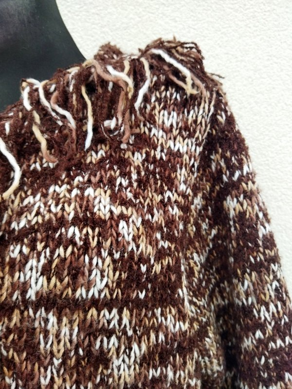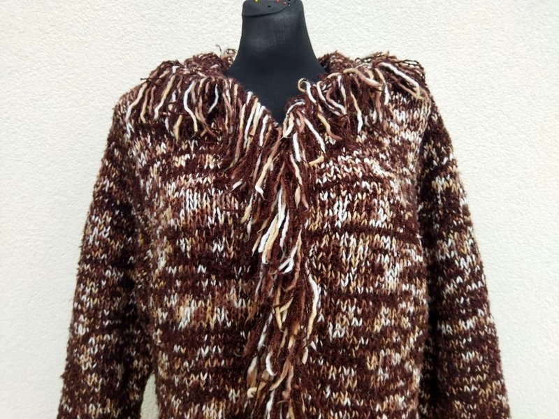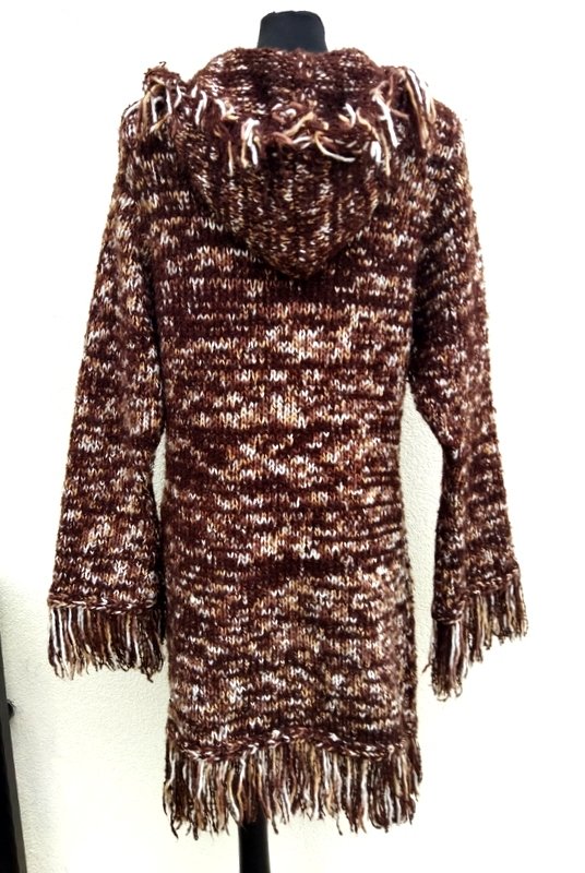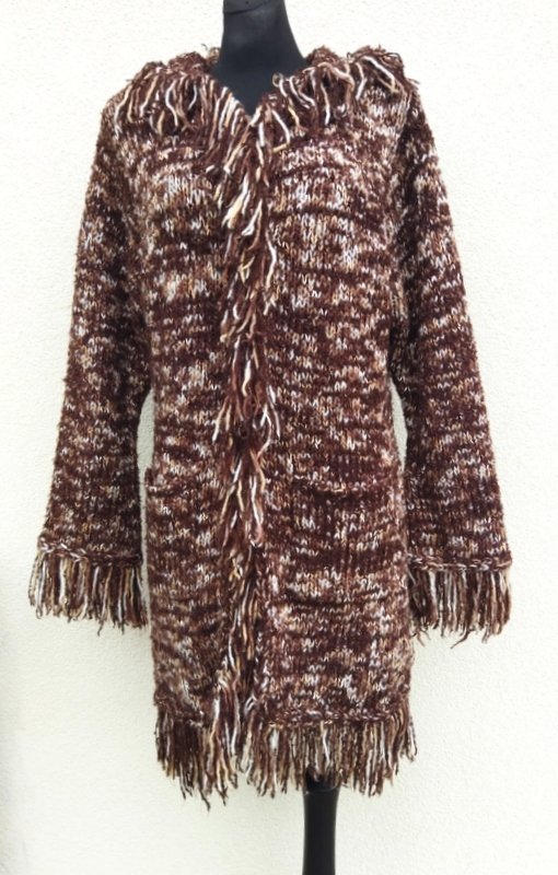 Dłuższy sweter lub dzianinowy płaszcz z akrylowej włóczki w melanżowej kolorystyce odcieni brązu i bieli. z kapturem . Wykończony frędzlami. Zapinany od wewnątrz na guziki