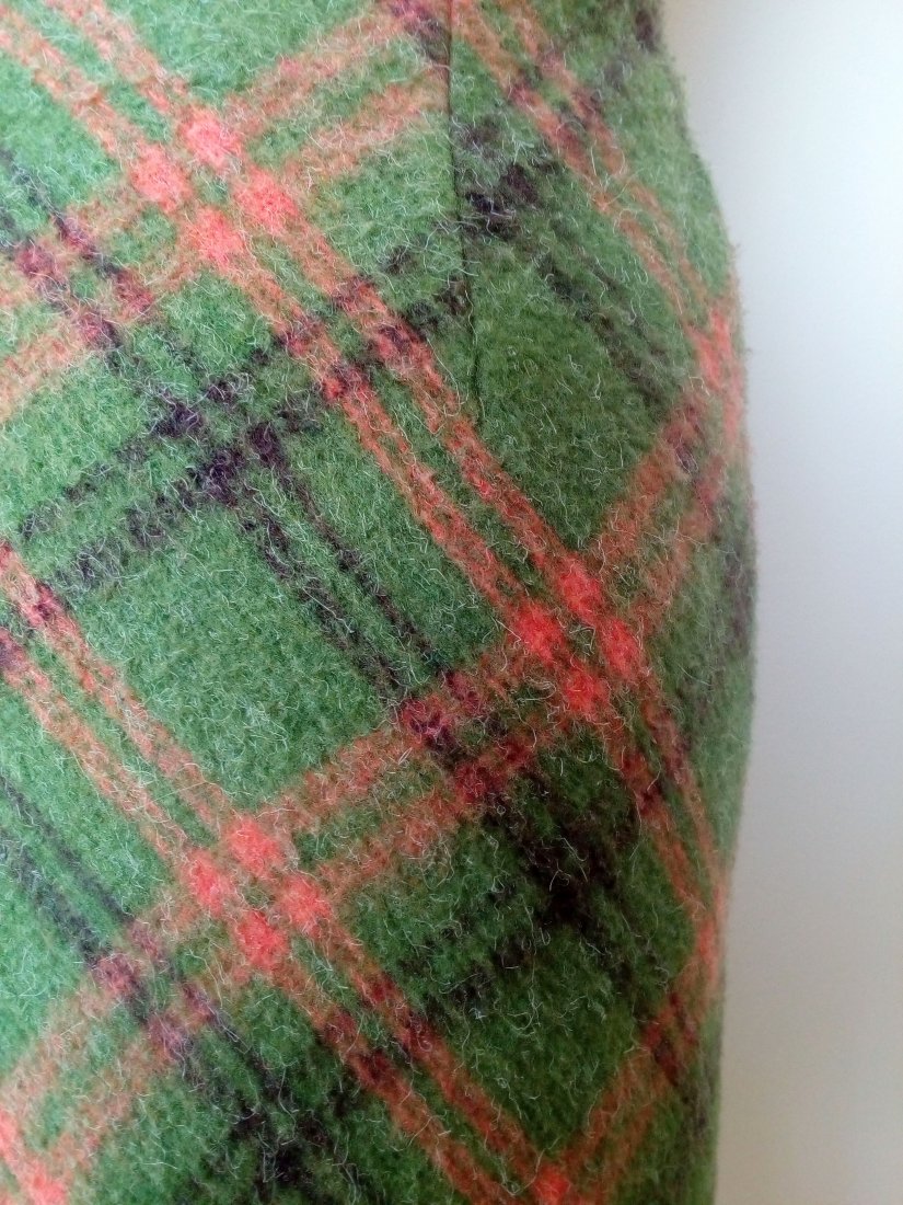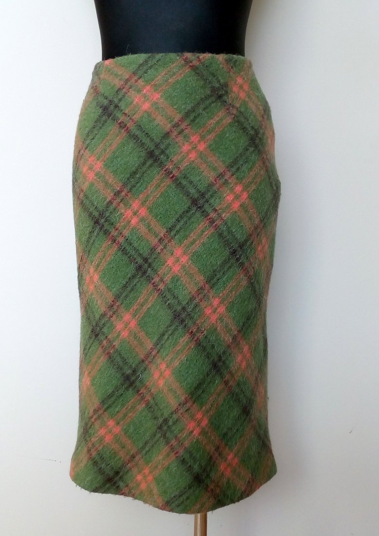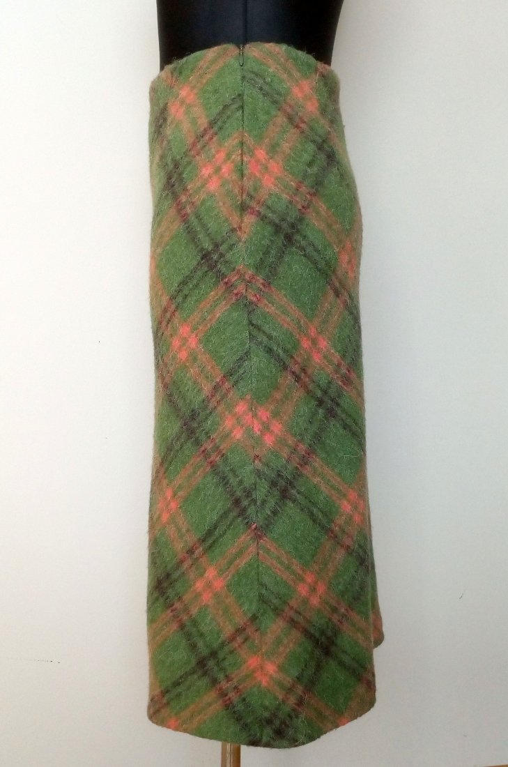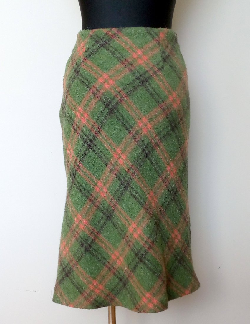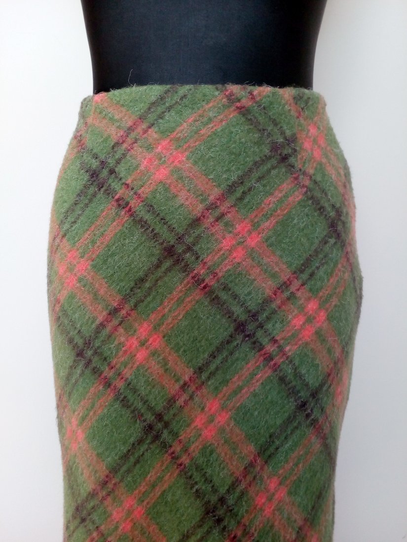 Ciepła spódnica z wełną, zapinana z boku na zamek, leciuteńko rozszerzana do dołu, kolorystyka - trawiasta zieleń, zgaszony pomarańczowy i czarny, od środka zielona podszewka
