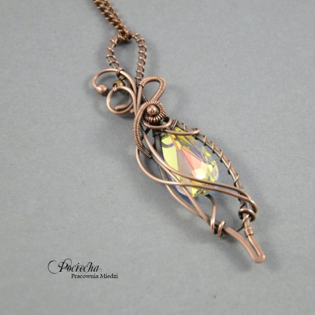 Uroczy naszyjnik z wisiorem w stylu baśniowym. Wisior od podstaw wykonany został ręcznie z miedzi. Jego centrum stanowi piękny kryształ Swarovski Tear (6100) Crystal Aurore Boreale 24 mm.
