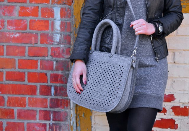 Fantastyczna torebka z szarego filcu z wygodnymi w trzymaniu rączkami. Przez kółeczka o średnicy 5 mm