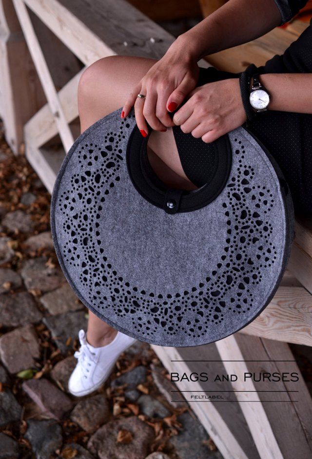 - model: FeltLace - kolekcja: filcMe - kształt: koło - zapięcie: czarny nap - kolor: szary/czarny - wymiary: średnica 40 cm - materiał: filc 4 mm - uchwyt: do ręki/na ramię (średnica otworu 13 cm) - szerokość boku: 9 cm - dopinany pasek o długości 120 cm - dekorację przedniej części torebki stanowi laserowo wycinana koronka (część ta jest dodatkowo usztywnioną warstwą czarnego filcu, który prześwituje w wyciętych otworkach)