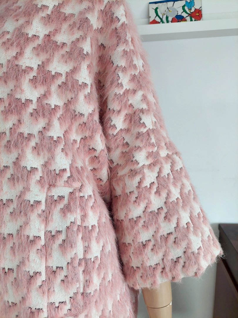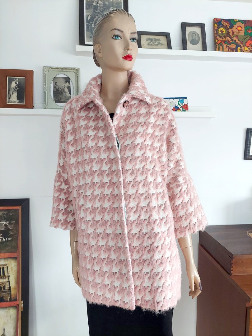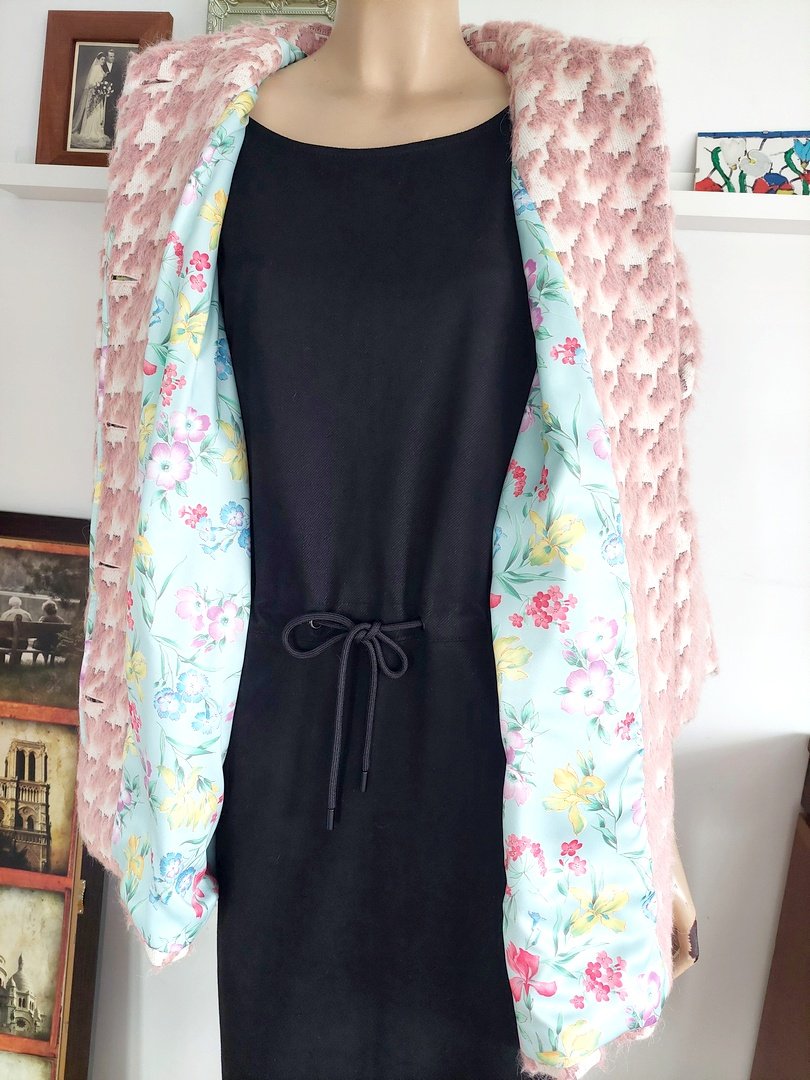 piękny włoski płaszcz wiosna/jesień marki Michele Rossi. Materiał 36% bawełna, 21% poliester, 16% akryl 14% alpaka, 13% wełna. kolor zgaszony różowy i ecru. pod spodem oryginalna niebieska podszewka w kwiaty. zapięcie na guziki pod plisą, kieszenie z przodu do wewnątrz, rękaw obniżony Rozmiar z metki 42. fason oversize. na manekinie o rozmiarze małe 38. proszę sprawdzić wymiary. stan super. Podaję wymiary mierzone na płasko;