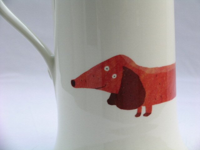 Duży dzbanek porcelanowy o zabawnych proporcjach i dowcipnym, jamnikowym zdobieniu. Sygnowany, z autorskiej serii Fenella Smith, ręcznie malowany. Jakość wykonania - świetny jako dzban herbaty otwarty, na ciepłe mleko, kakao... Nadaje się do zmywarki. No i ten guziczek u podstawy uchwytu - dla uśmiechu :) Góra 8,5; szer. 14,5; wys. 19 cm. Stan zachowania bardzo dobry. Użytkowy i designerski skarb na pokolenia.