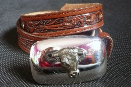 Oryginalny pasek uszyty z grubej naturalnej skóry. Wytłaczany i nabijany ozdobnymi napami. Metalowa klamra ozdobiona głową byka.Zapinany na bolec.