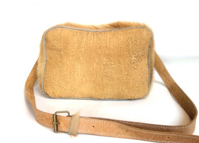 Średniej wielkości skórzana torebka w kształcie pudełeczka. po bokach futro, z przodu i z tyłu fakturowany zamsz. do noszenia na regulowanym pasku na ramię, na skos - jak kto chce. Wyjątkowa.
