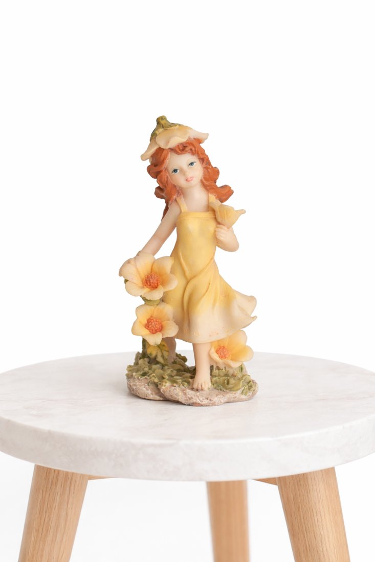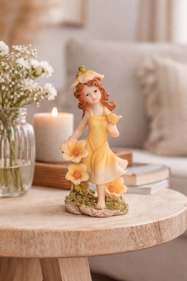 Urocza figurka wróżki w pastelowych kolorach, przedstawiająca dziewczynkę w delikatnej żółtej sukience otoczoną kwiatami. Subtelne detale, spokojny wyraz twarzy i romantyczny styl sprawiają, że figurka pięknie prezentuje się jako dekoracja w domu.