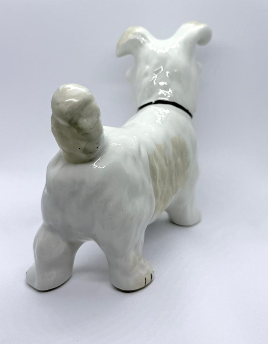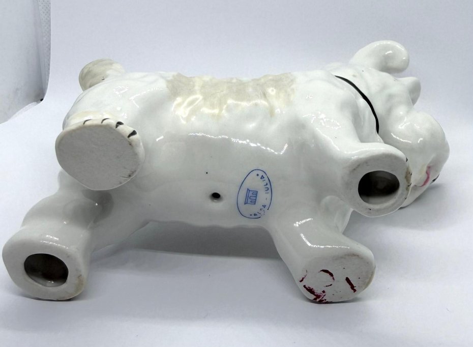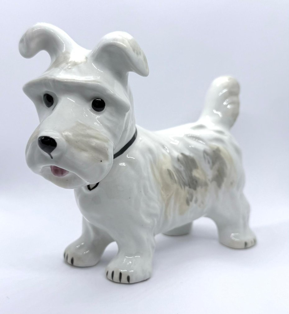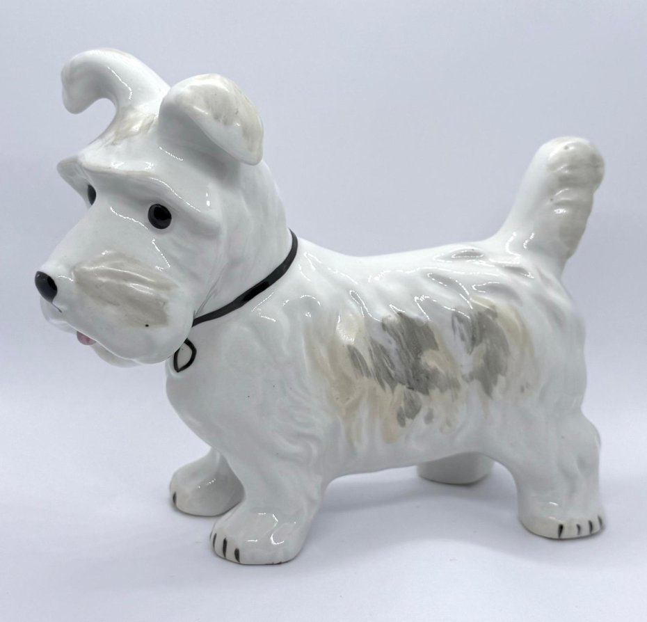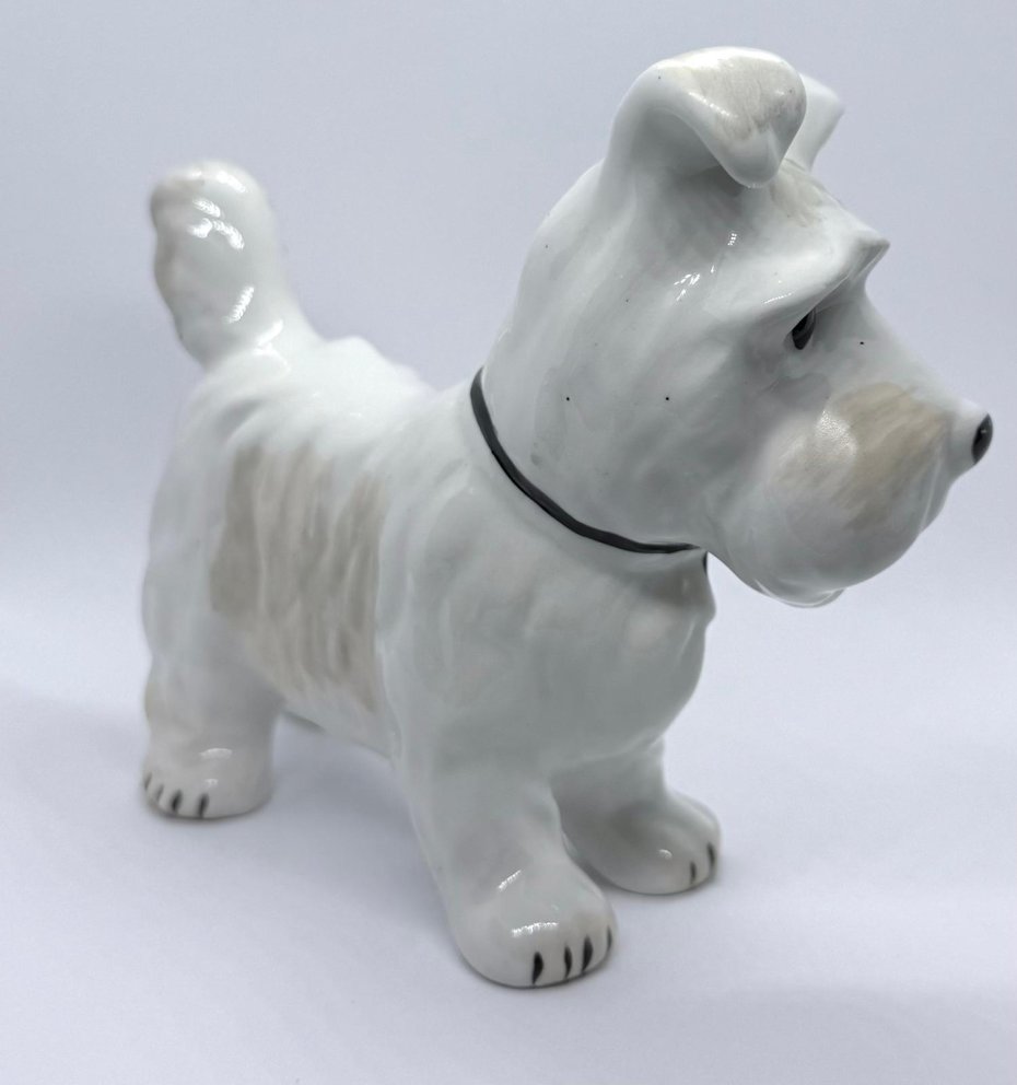 Urocza, porcelanowa figurka przedstawiająca Teriera (w typie Teriera Szkockiego lub Westie), wykonana w renomowanej rumuńskiej wytwórni Alba Iulia - sygnowana od spodu