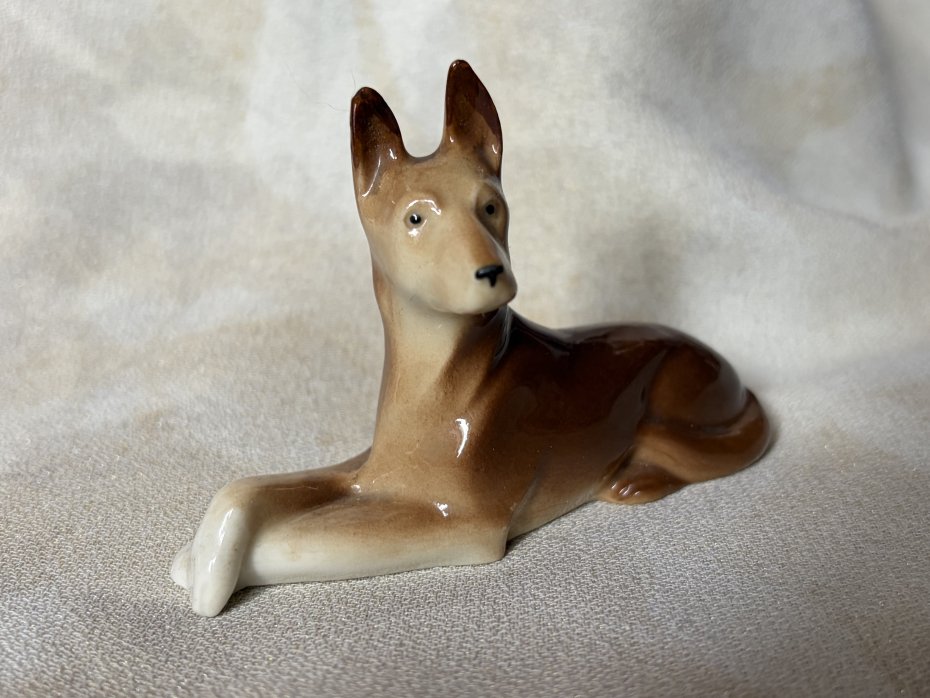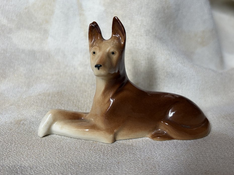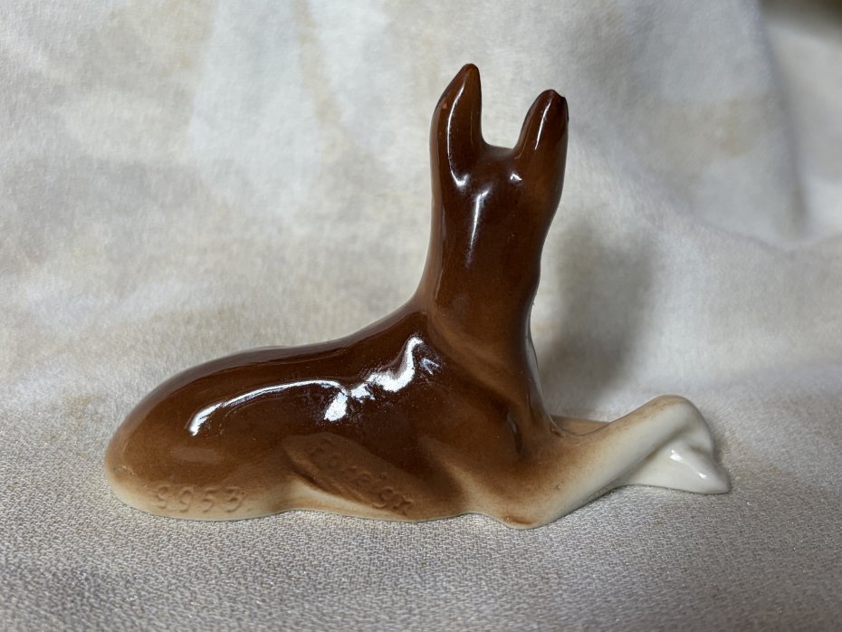 Porcelanowa figurka , nie sygnowana , dobrze wykonana . Dół 9,5 x prawie 3 wysokość 6,5 cm . Naturalne barwy błyszczące szkliwienie . Stan zachowania - naprawiane jedno z uszek . Dobry