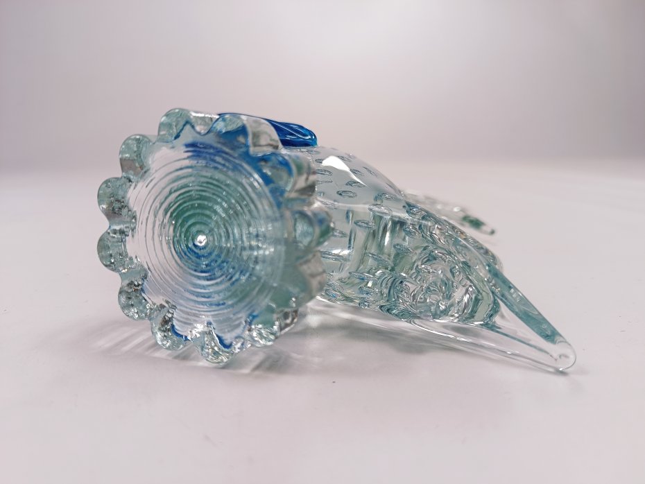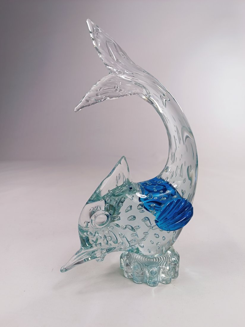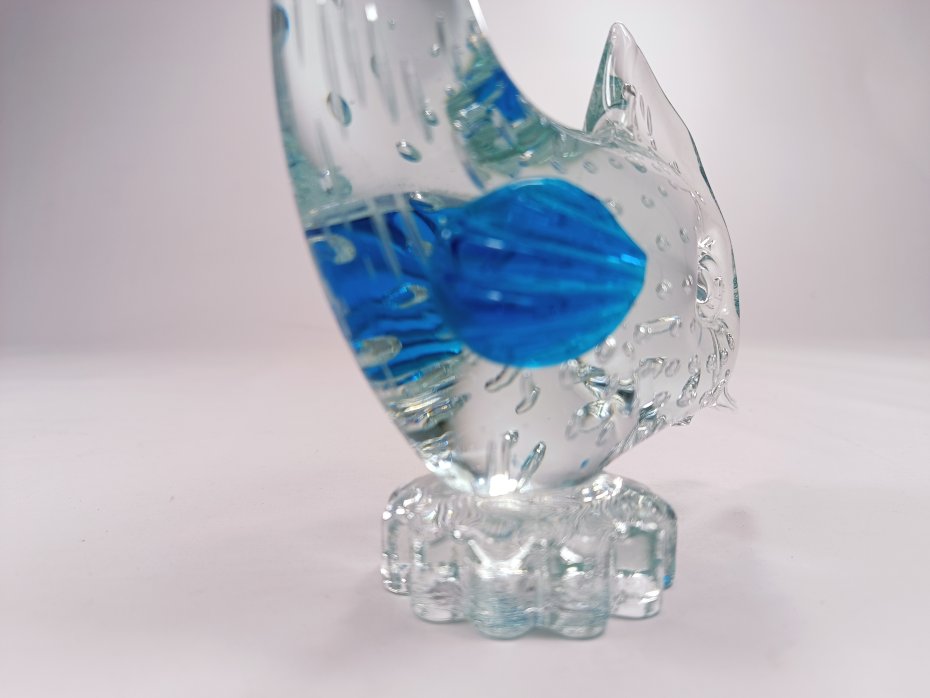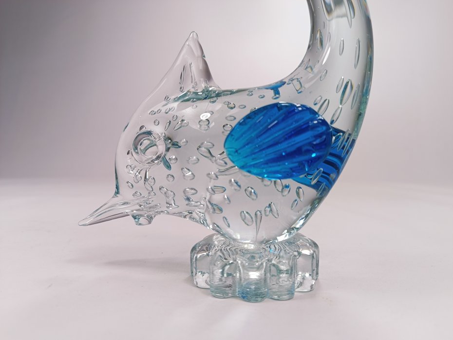 Figurka przedstawiająca rybę, wykonana ze szkła Murano z pęcherzykami powietrza zanurzonymi wewnątrz szkła. Stan zachowania bardzo dobry, bez uszkodzeń. Wysokość 22 cm.