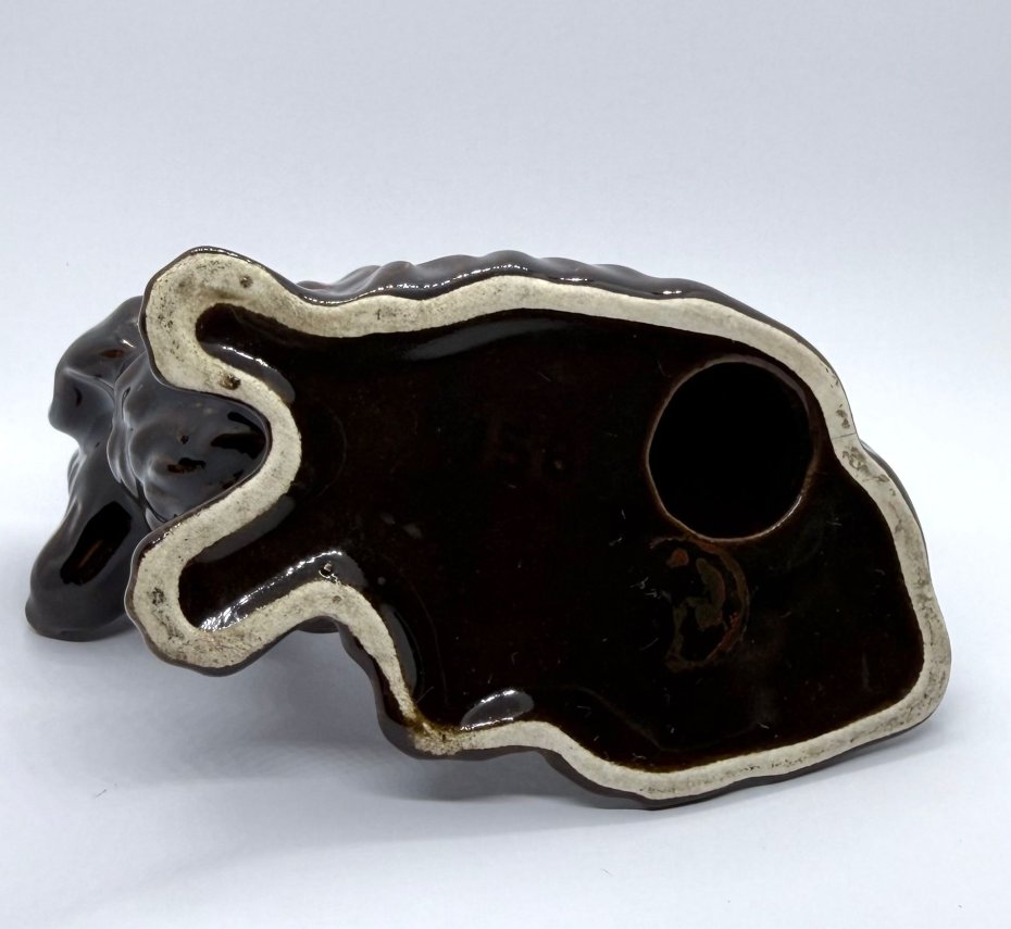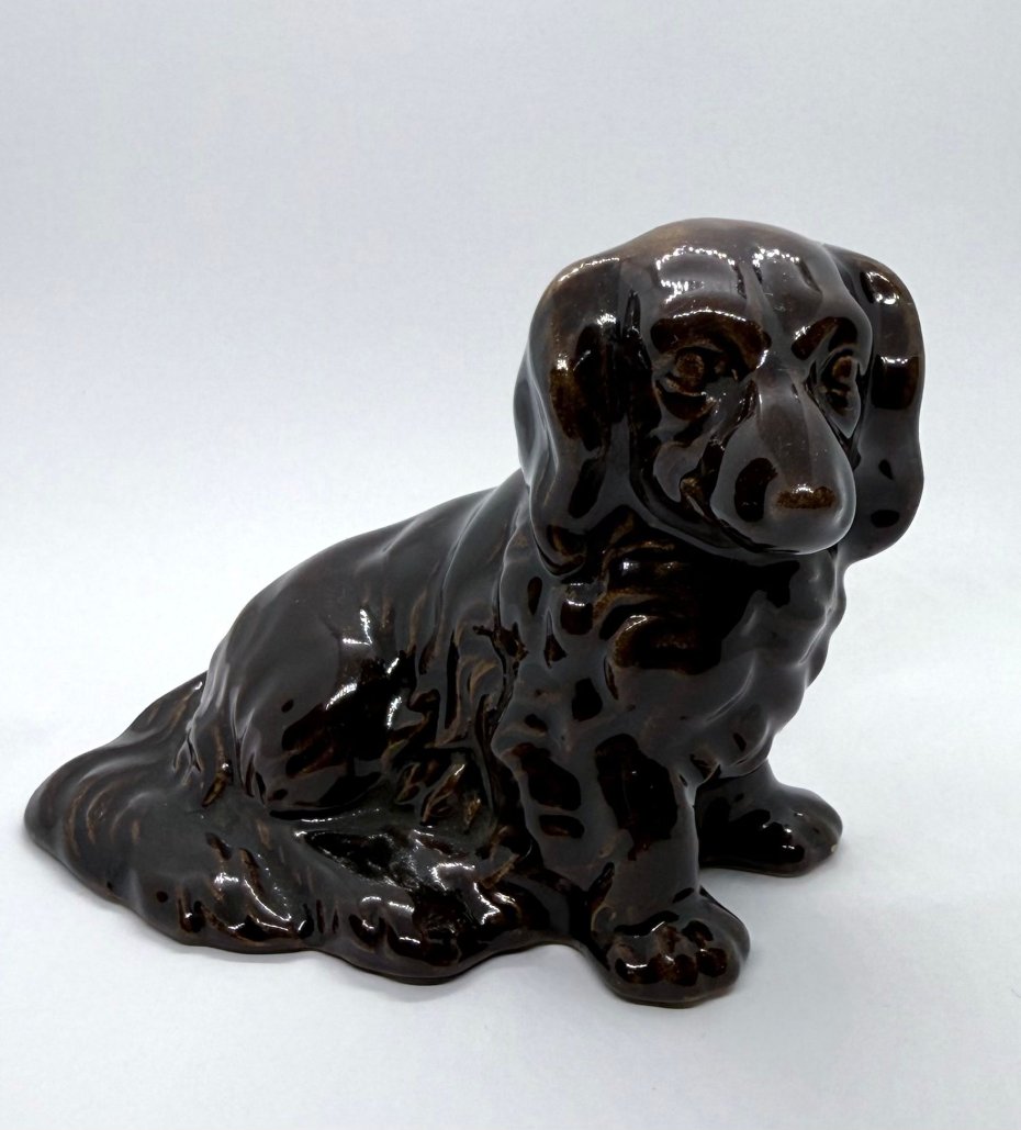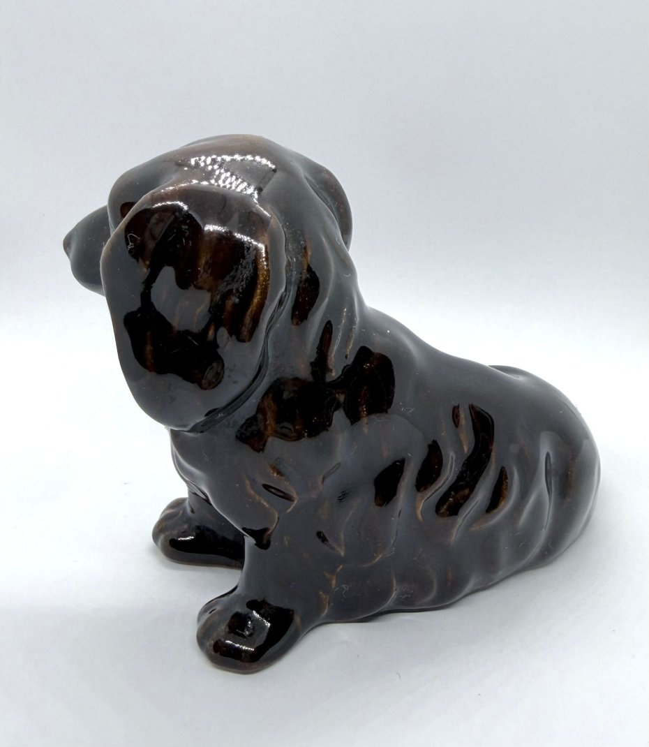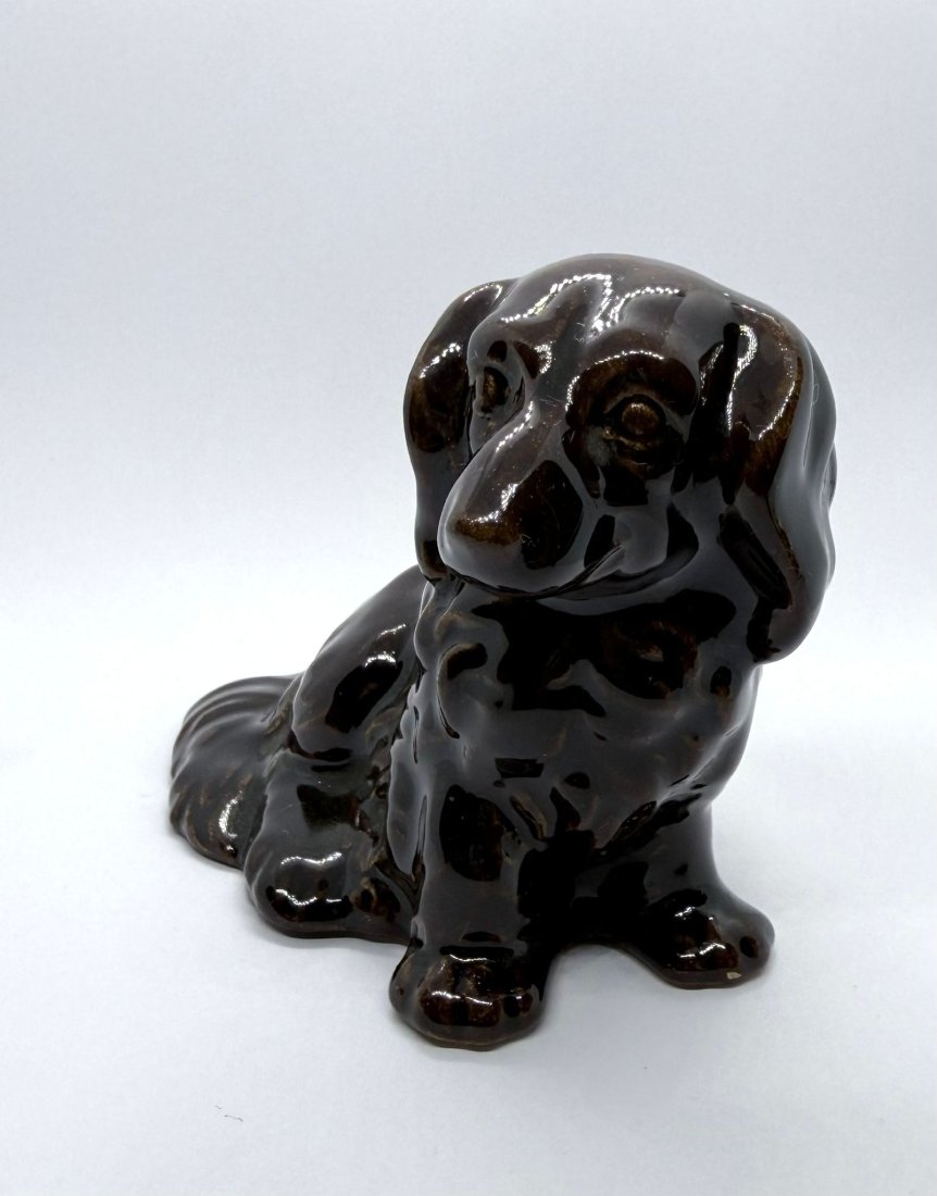 Stylizowana figurka siedzącego jamnika długowłosego, wykonana z wysokiej jakości rumuńskiej ceramiki. Przedmiot przyciąga wzrok głębokim, czekoladowym kolorem i lustrzanym połyskiem szkliwa, które efektownie podkreśla fakturę długiej sierści. Na spodzie znajduje się wyciśnięty w masie numer seryjny, typowy dla tamtejszych manufaktur z epoki.