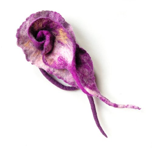 Broszka wykonana z własnoręcznie filcowanej naturalnej, wysokiej jakości wełny z merynosów australijskich. Zapięcie broszkowe. Długość całości: 18,0cm; średnica kwiatka: ok. 7,0cm, wysokość ok. 4,5cm. Kolory - odcienie fioletu, biały, żółty.