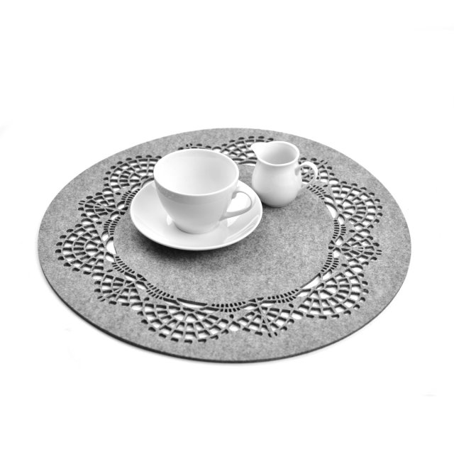 okrągła, filcowa serwetka wycinana metodą laserową w piękne ażurowe wzory - model:filcowa serwetka Matyldy - kolekcja: padMe - kształt: koło - kolor: szary - liczba elementów: 1 - wymiary: średnica 45 cm - materiał: filc 4 mm - interesuje Cię inna wielkość/ilość? inny kolor? napisz do nas!