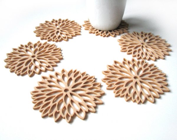 Zestaw sześciu ślicznych podkładek pod kubki, szklanki, filiżanki..itp. Wycięte z filcu 4mm w kolorze beżowym. urocze, frywolne, lekkie, delikatne. Pięknie wyglądają na stole, mogą stanowić zestaw z dostępną w galerii pojedynczą serwetką o średnicy 34cm. Idealnie nadają się na prezent.