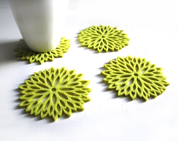 Zestaw czterech ślicznych podkładek pod kubki, szklanki, filiżanki..itp. Wycięte z filcu 4mm w kolorze jasnej, wiosennej zieleni. Urocze, frywolne, lekkie, delikatne. Pięknie wyglądają na stole, mogą stanowić zestaw z dostępną w galerii pojedynczą serwetką o średnicy 34cm czarną lub szarą. Idealnie nadają się na prezent. polecam średnica serwetki 9,7cm, prać ręcznie w temperaturze 30 stopni.