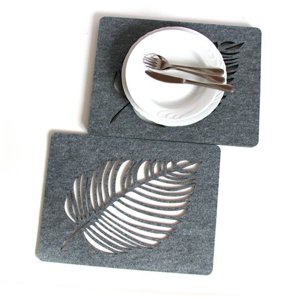 Zestaw sześciu podkładek pod talerze, wyciętych laserowo w szarym filcu. Prostokątne, na środku wycięty ażurowy liść. Oryginalne, stanowią uroczy dodatek dla wnętrza. Grubość filcu 4mm, więc podkładki idealnie nadają się również jako podkładki pod duże naczynia, chroniące stół przed zniszczeniem. Idealne również na prezent. Istnieje możliwość ciekawego skompletowania podkładek z dostępnymi w sklepie produktami z tej samej kolekcji. polecam!