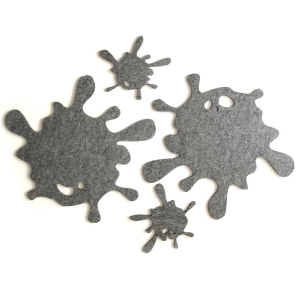 Zestaw czterech fantastycznych podkładek, w kształcie rozlanej plamy, dwie pod talerze i dwie pod kubki,. Niesamowicie oryginalny dodatek na stole, idealne na imprezę, sylwestra lub jako jedyny w swoim rodzaju prezent dla bliskiej osoby. Wycięte laserowo w szarym filcu grubości 4mm,