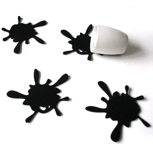 Zestaw czterech fantastycznych podkładek w kształcie rozlanej plamy. Niesamowicie oryginalny dodatek na stole, idealne na imprezę, sylwestra lub jako jedyny w swoim rodzaju prezent dla bliskiej osoby. Wycięte laserowo w czarnym filcu,