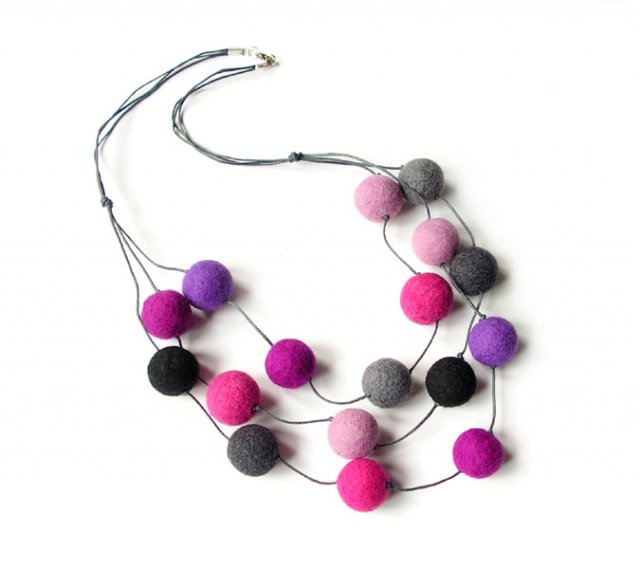 Filcowe korale wykonane z własnoręcznie filcowanych kulek z naturalnej, wysokiej jakości wełny z merynosów australijskich na szarym sznurku woskowanym, zapięcie typu karabińczyk. Długość korali: ok. 61,5cm. Średnica największej kulki: ok. 2,1cm. Kolory: odcienie szarości i fioletu, fuksja.