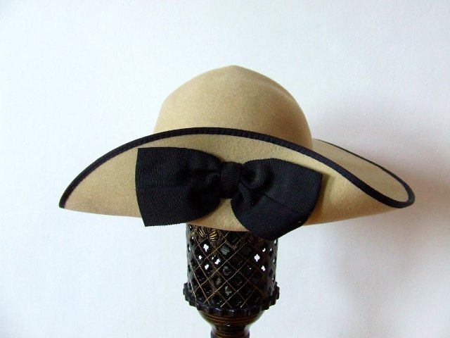 Filcowy wełniany kapelusz w kolorze beżowym, obszyty wokół ronda czarną kontrastową lamówką i ozdobiony z tyłu lub z przodu (zależy od noszenia) czarną kokardką.