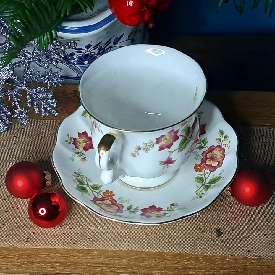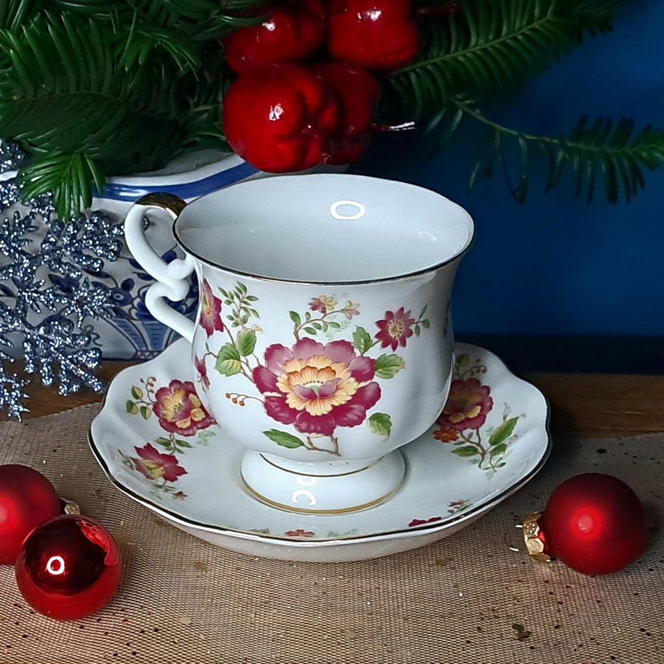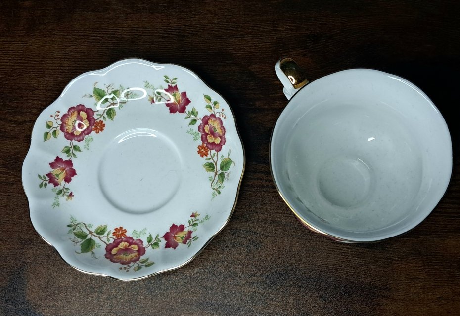 Filiżanka ze spodkiem, wykonana z delikatnej porcelany kostnej (fine bone china) w Anglii, datowana na lata 60. XX wieku. Wzór charakteryzuje się wielobarwnymi, głównie różowymi i czerwonymi kwiatami róż oraz zielonymi liśćmi, a całość ozdobiona jest złotymi wykończeniami.