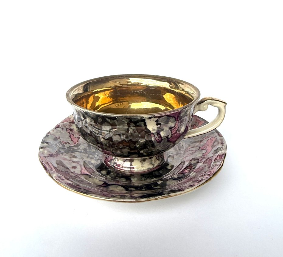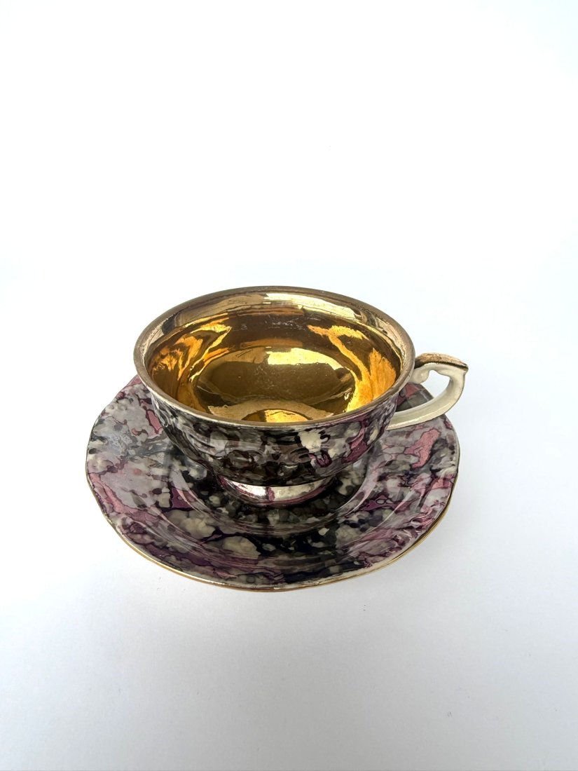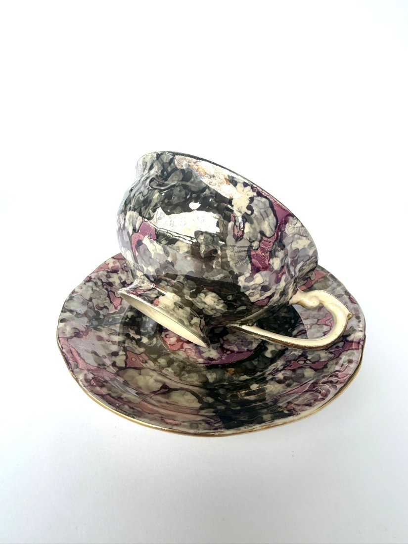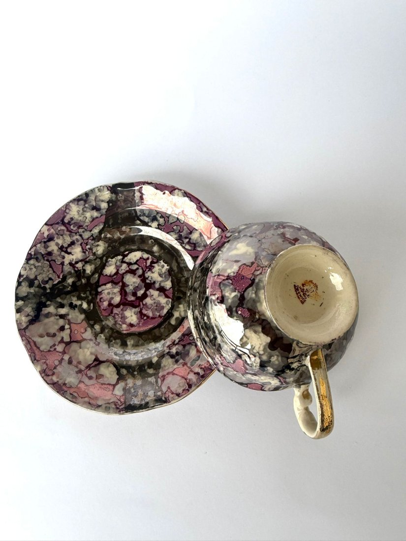Wyjątkowej urody, oryginalna filiżanka z podstawkiem z wytwórni Tułowice. Wykonana z porcelany. Poszukiwana przez kolekcjonerów dekoracja marmurek w wyjątkowo rzadkiej palecie barw. Połączenie fioletów, szarości, srebrzystych refleksów i delikatnych akcentów złota tworzy efekt głębokiego, eleganckiego marmuru o wyraźnie kolekcjonerskim charakterze. Lustrzana powierzchnia pięknie odbija światło, podkreślając nieregularny, artystyczny układ barw.