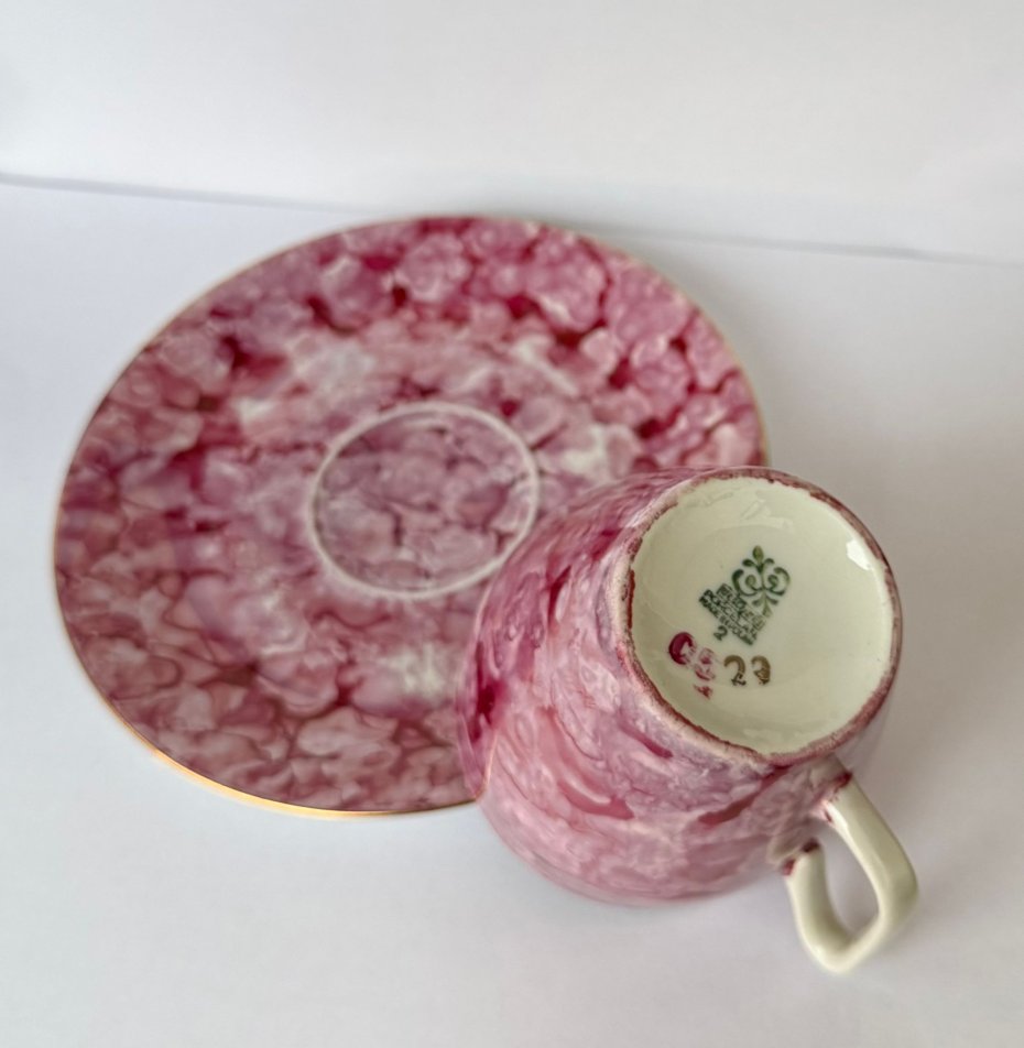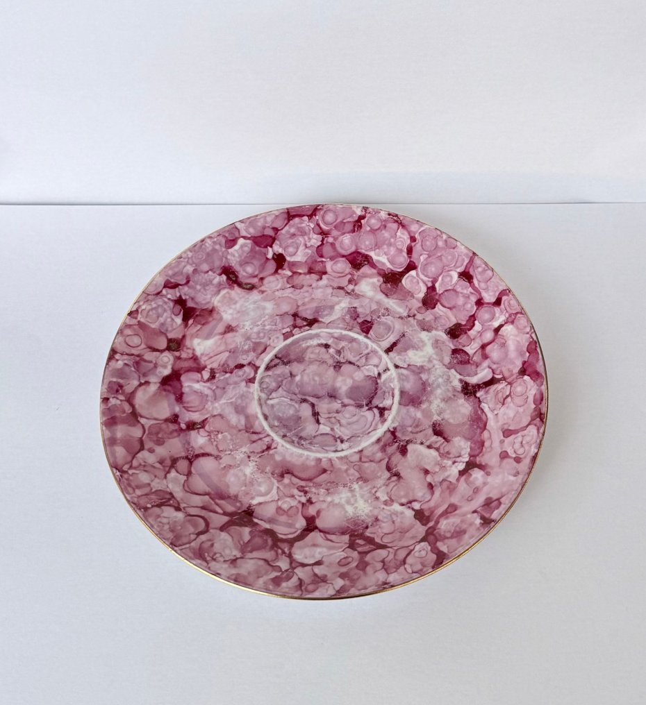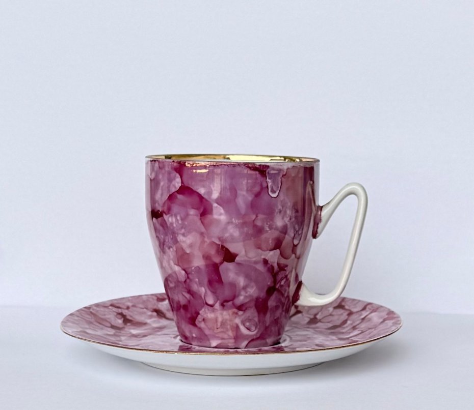 Zestaw wykonany z wysokiej jakości białej porcelany, pokryty kultową malaturą typu "marmurek" w odcieniach intensywnego różu i fuksji oraz delikatnym złoceniem.