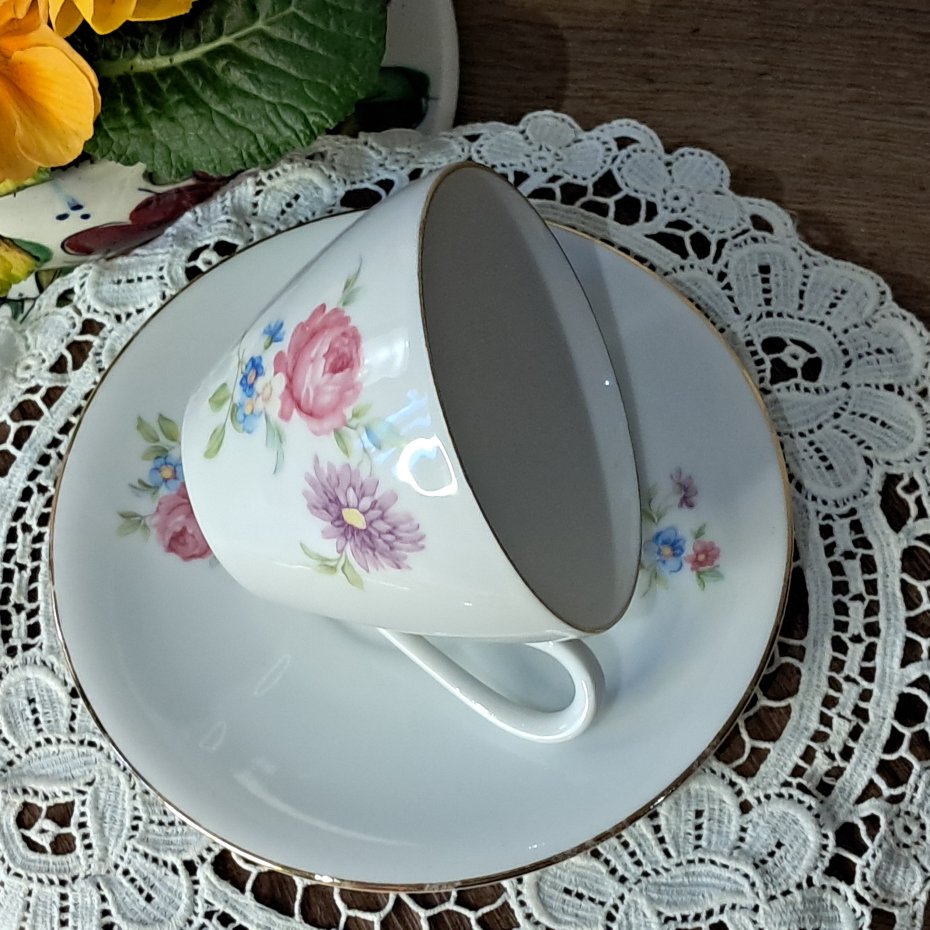 Klasyczna porcelana z lat 50 tych, delikatny pastelowy motyw kwiatowy, cienka złota linia przy rancie. Bardzo elegancka, romantyczna forma – idealna do kolekcji, witryny lub codziennej kawy.