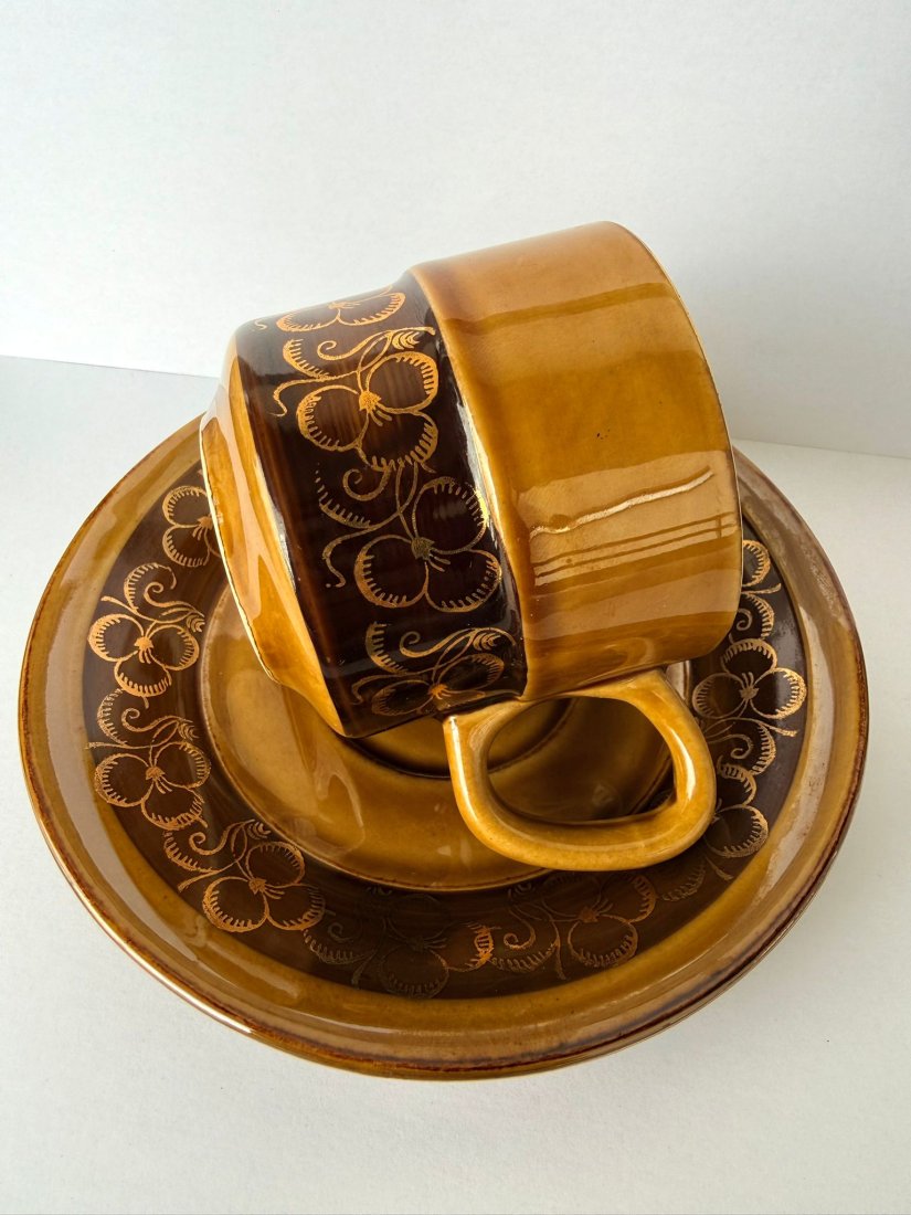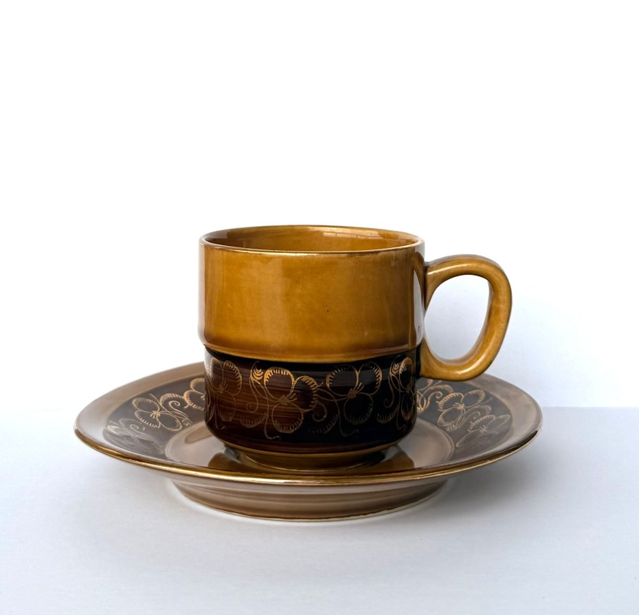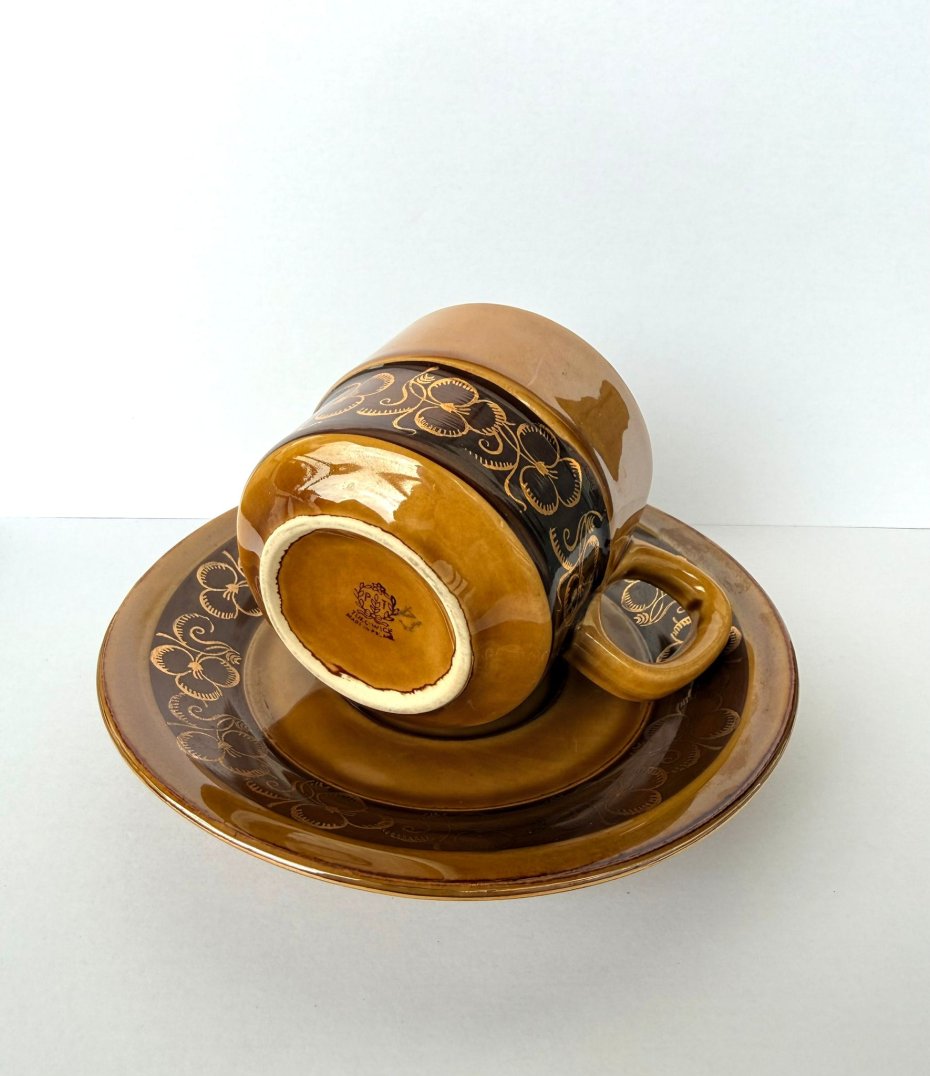 Oryginalna filiżanka wytwórni Tułowice. W komplecie ze spodkiem. Wykonana w charakterystycznej ceramice miodowej z dekoracyjnym motywem kwiatowym. Projekt z lat 70.–80. XX wieku, idealny dla miłośników polskiego designu PRL, stylu retro i vintage. Ciepła brązowo‑miodowa glazura, wyraźny ornament i solidne wykonanie sprawiają, że to piękny przykład polskiej ceramiki użytkowej.