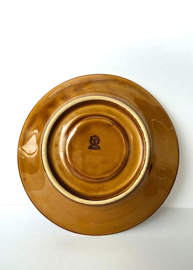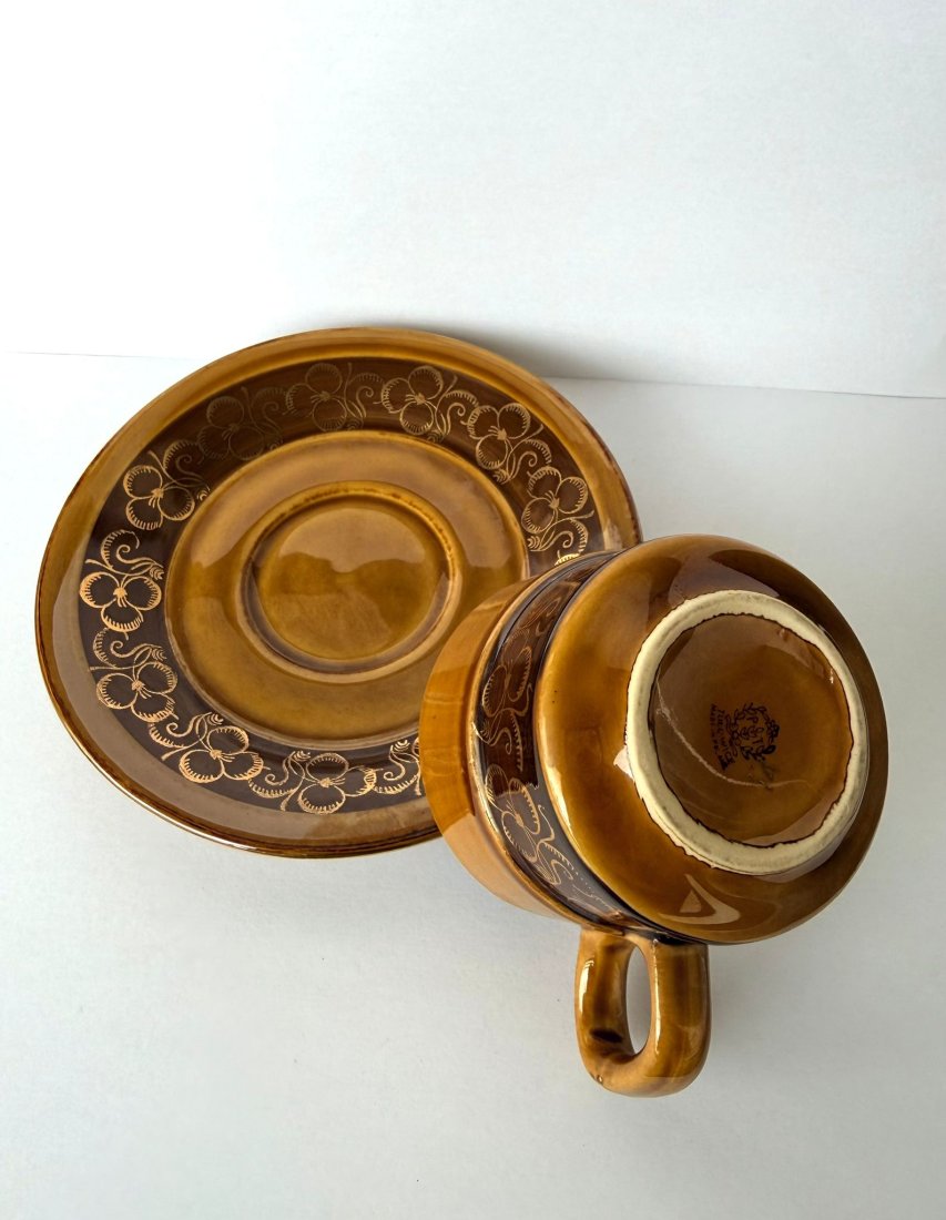 Oryginalna filiżanka wytwórni Tułowice. W komplecie ze spodkiem. Wykonana w charakterystycznej ceramice miodowej z dekoracyjnym motywem kwiatowym. Projekt z lat 70.–80. XX wieku, idealny dla miłośników polskiego designu PRL, stylu retro i vintage. Ciepła brązowo‑miodowa glazura, wyraźny ornament i solidne wykonanie sprawiają, że to piękny przykład polskiej ceramiki użytkowej.