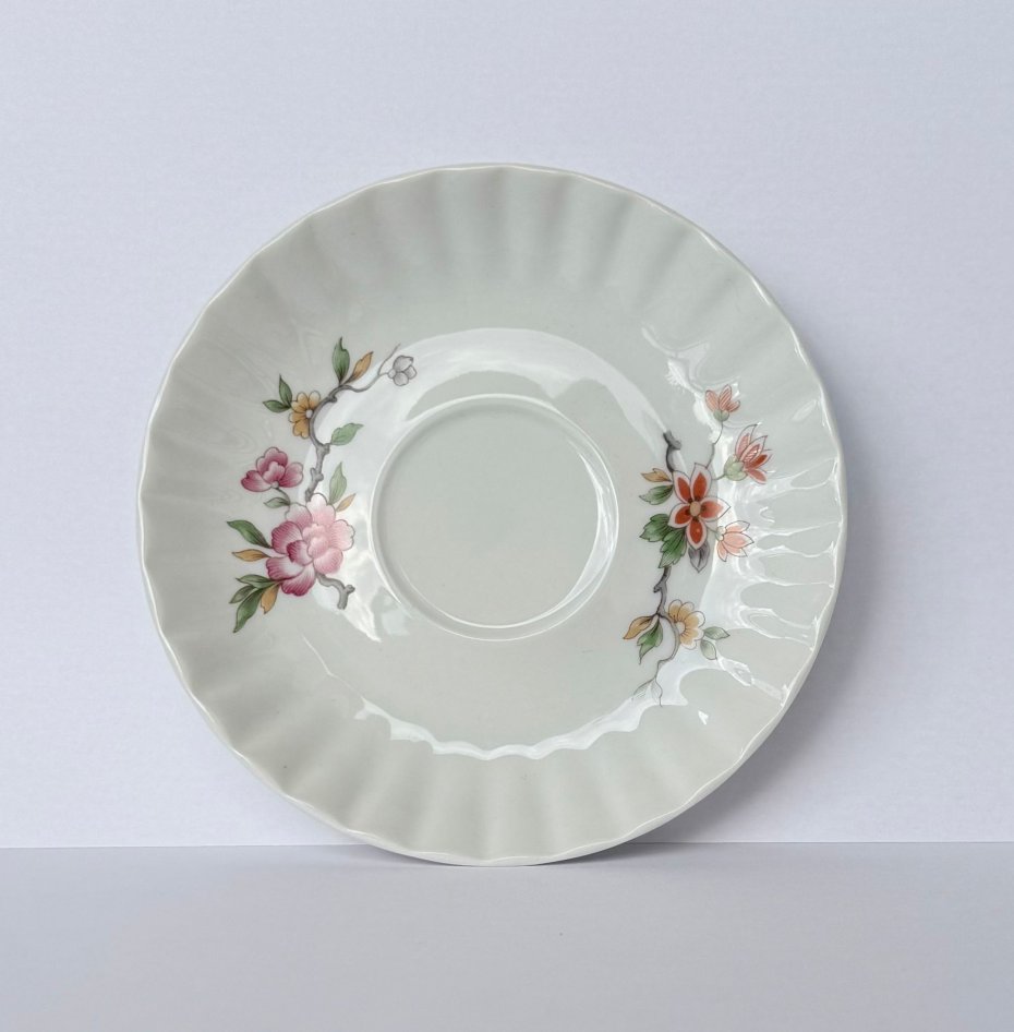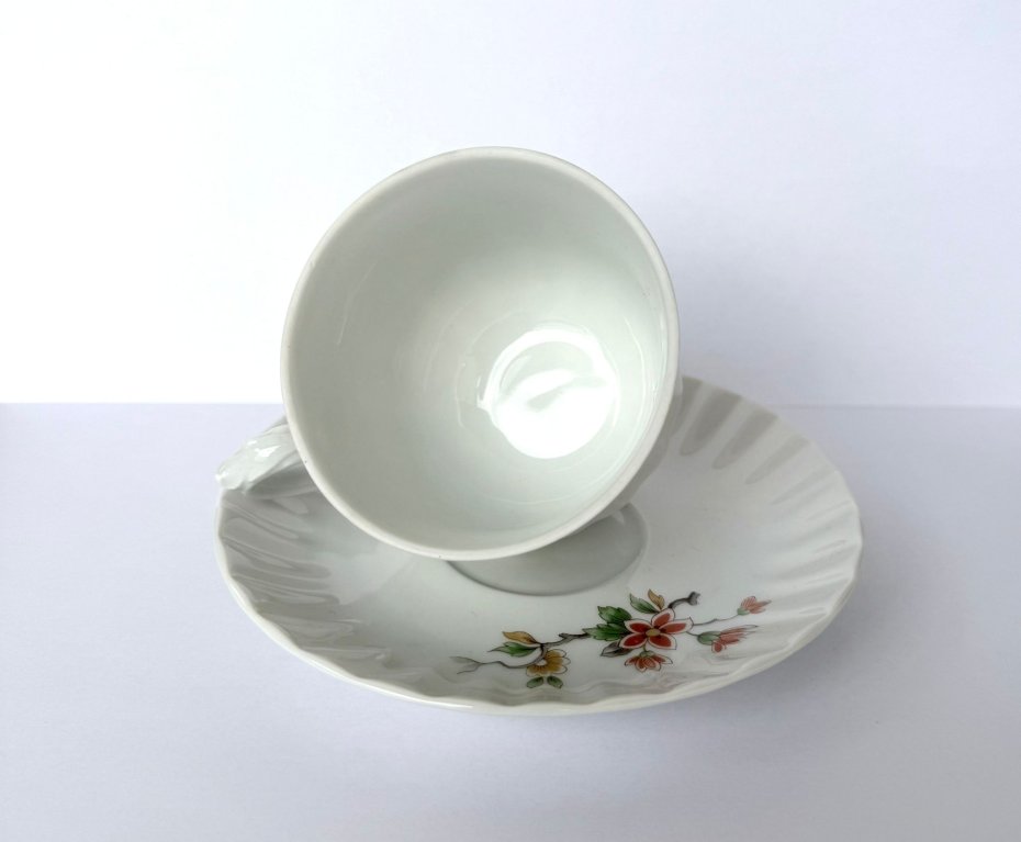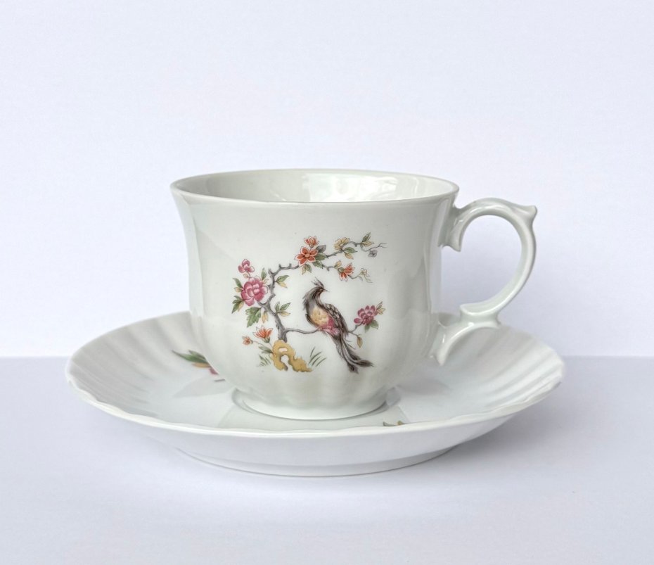 Filiżanka zdobiona jest pięknym motywem ptaka na gałązce, otoczonego kwiatami w pastelowych barwach. Delikatnie profilowane ucho oraz falowany brzeg spodka podkreślają elegancki charakter zestawu.